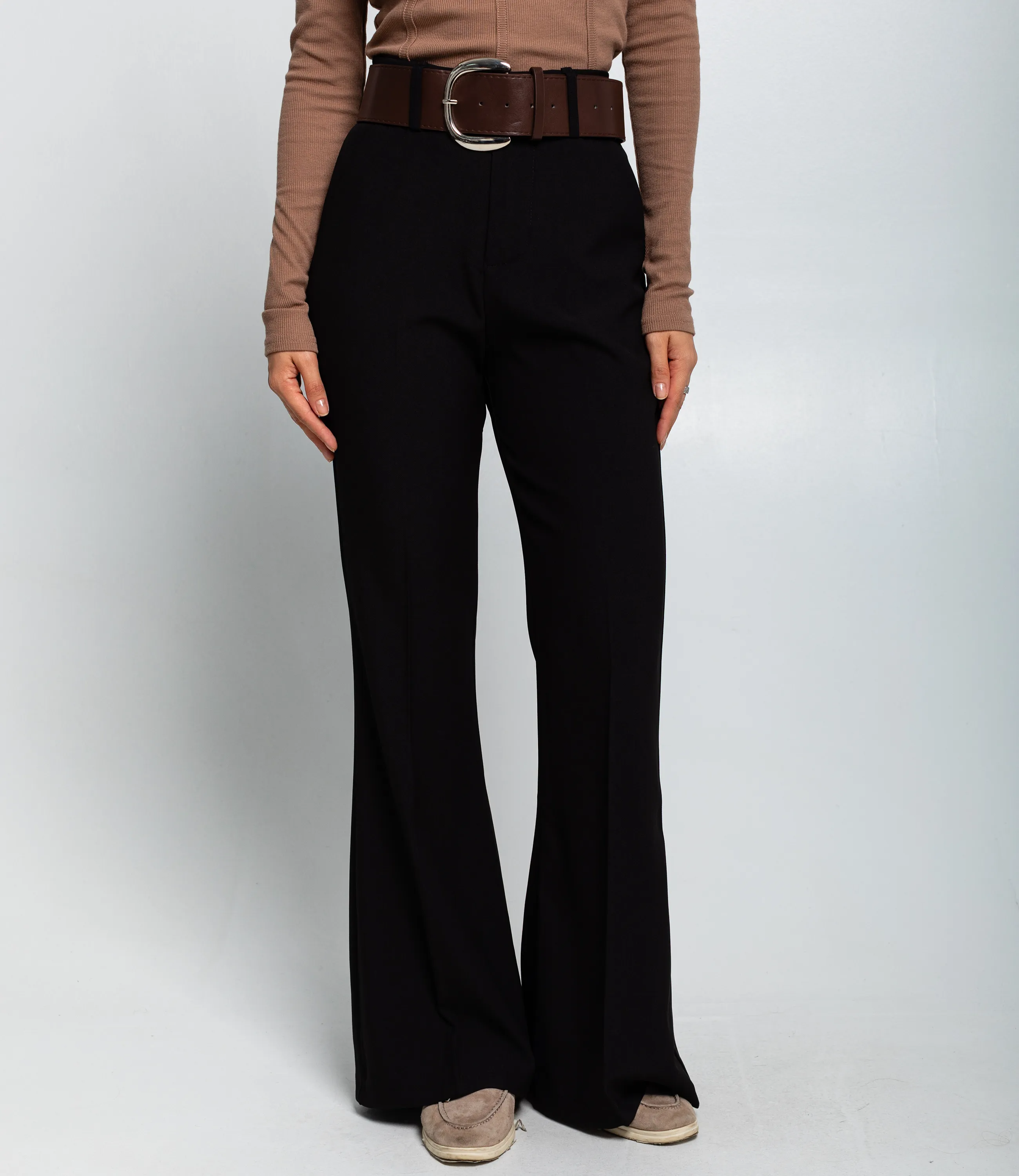 Брюки — это незаменимый элемент гардероба, который подчеркивает стиль и индивидуальность каждой женщины. Брюки выполнены в женственном фасоне клёш с высокой посадкой и скрытой застёжкой‑молнией впереди. По бедрам посадка приталенная, плавно расширяющаяся от колена вниз до широкого расклёшённого низа; швы по передней части удлиняют силуэт. В поясе предусмотрены шлевки для ремня, которые подчёркнуты широким коричневым ремнём на образе; карманы в боковых швах незаметны, что сохраняет чистоту линий. Состав: 65% полиэстер, 35% хлопок. Обратите внимание на современный крой и удобную посадку, которые ваши покупатели оценят по достоинству. Мы также предоставили таблицу размеров на нашем сайте, чтобы все могли выбрать идеальный вариант. Наша цена является приемлемой для оптовых покупателей, что делает эту модель отличным дополнением к вашему ассортименту. Дайте вашим клиентам возможность выглядеть стильно и чувствовать себя комфортно с этими брюками, ведь каждая женщина заслуживает выражать свой индивидуальный стиль! Рост модели 164 см., 83-61-89. Вы можете заказать онлайн презентацию на интересующие Вас модели. Наши менеджеры свяжутся с Вами и проведут индивидуальную видеотрансляцию, помогут составить заказ и ответят на Ваши вопросы.