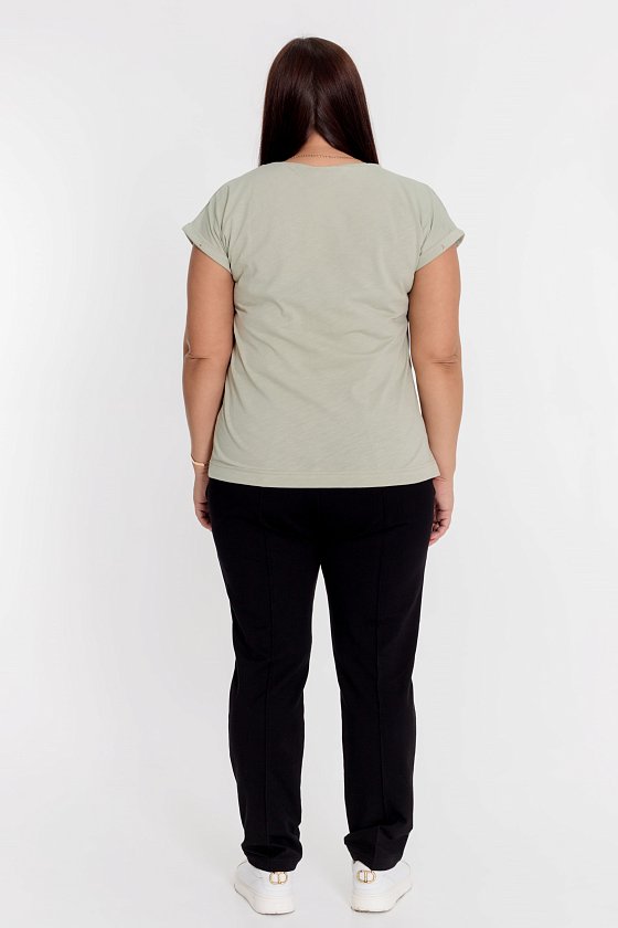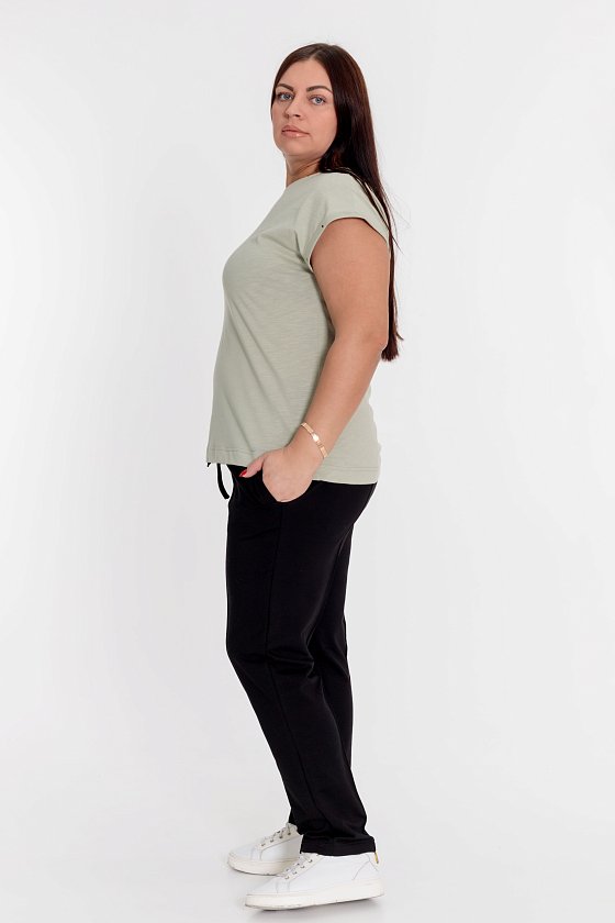 Женские брюки из футер петли с лайкрой. Пояс на резинке, через люверсы проложен шнур. По бокам расположены карманы.