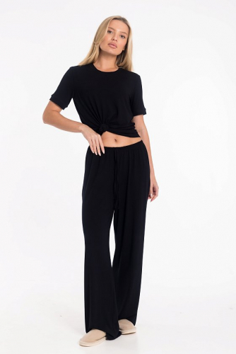 Женские брюки выполнены из однотонного синтетического полотна "лапша". Силуэт свободный, пояс на резинке, по бокам размещены карманы.