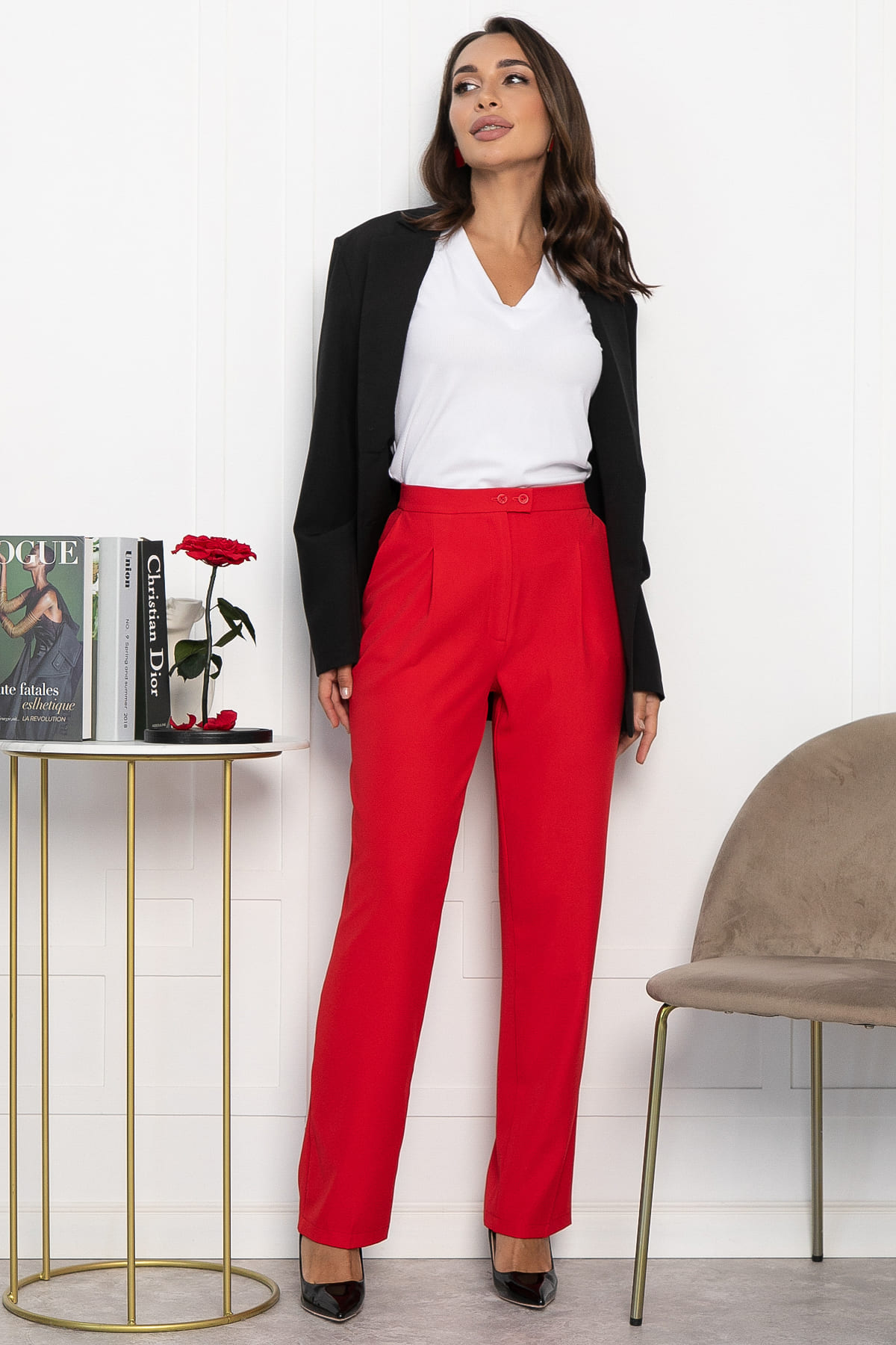Классические брюки с высокой талией — это must-have для современной женщины. Они идеально подходят как для деловых встреч, так и для повседневных прогулок. Высокая посадка подчеркивает талию, создавая изящный силуэт, а прямой крой добавляет строгости и стиля. Брюки оснащены удобным поясом с резинкой сзади, что обеспечивает идеальную посадку и комфорт. Боковые карманы и застежка на молнию с двумя пуговицами делают их функциональными и практичными.
