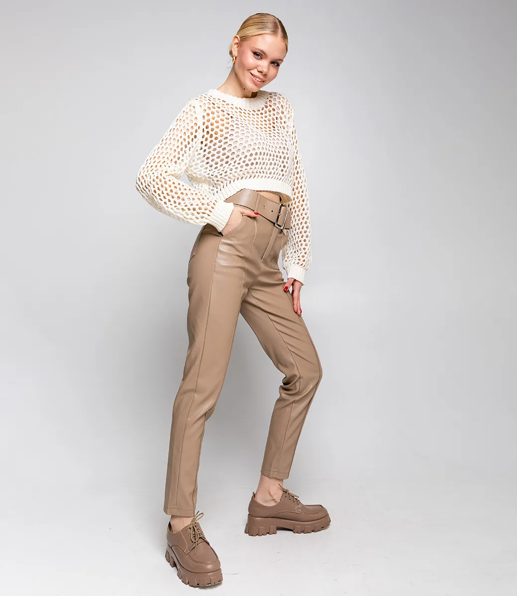 Брюки из экокожи – это предмет одежды, который подчеркивает женственность и привлекательность каждой представительницы прекрасного пола. Данная модель отлично подойдет для летнего сезона. Ее выбирают женщины, которые ценят сочетание идеального качества и стоимости. Фасон подчеркивает красоту фигуры. Производитель брюк знает, как разработать стильные решения. Для изготовления брюк использована ткань из 100% полиуретана, которая выделяется отличным качеством. Даже после многих стирок изделие не потеряет изначальной привлекательности. Обратите внимание на цвет. Он является насыщенным и полностью соответствует фотографии на сайте. Чтобы убедиться в размере, мы предоставили на странице таблицу. Воспользовавшись ею, вы сможете сами обмерить себя и убедиться. Предложенная нами цена является доступной. Подарите себе удовольствие быть элегантной! Рост модели 174 см, 80-58-88.