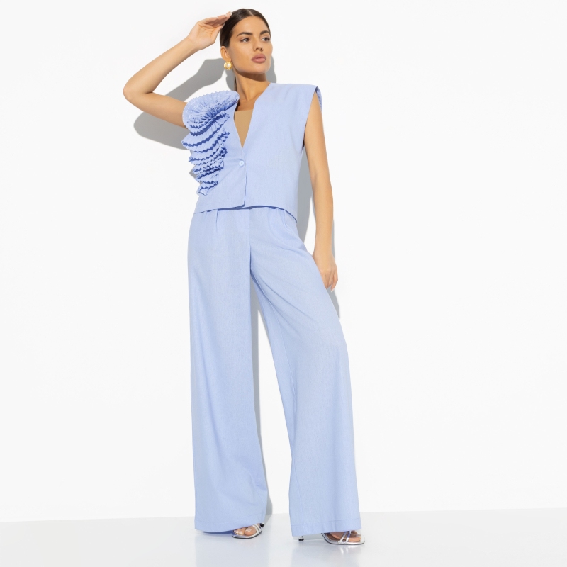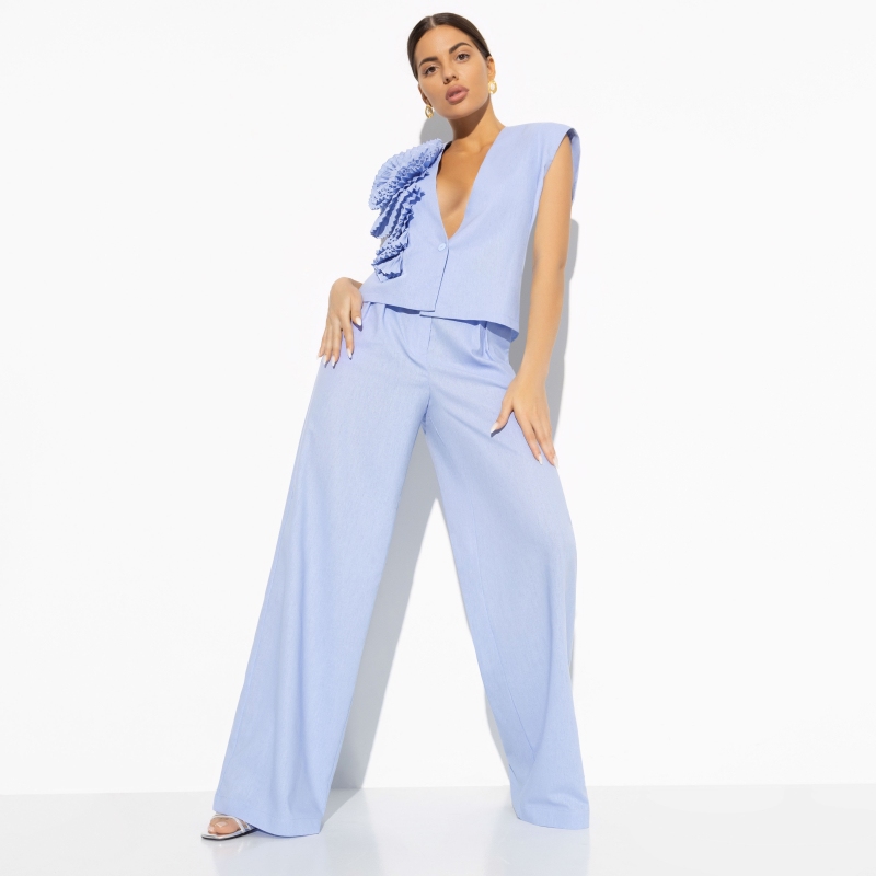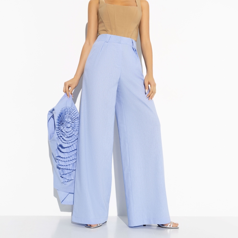 Брюки председателя женского модного сообщества. В модели в небесно-голубого цвета вы обретаете сверхполномечия. Например, определять на глаз отсутствие калорий в десерте, если вас им угостили.