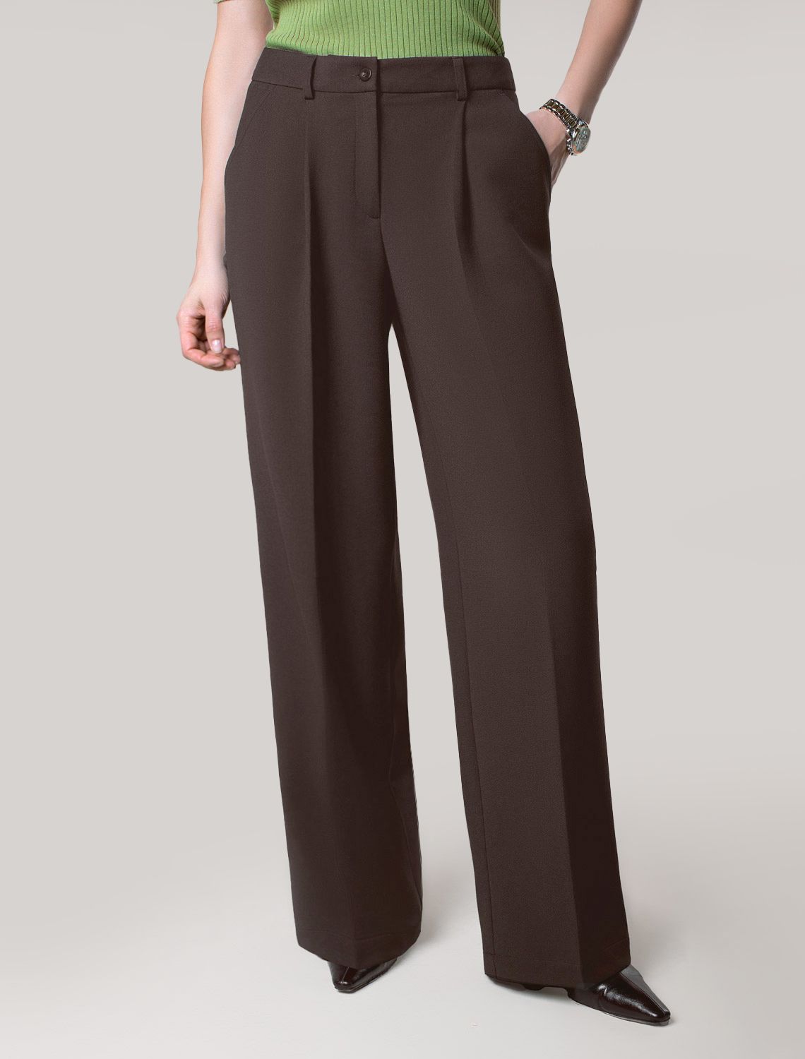 Брюки-палаццо выполнены из эластичной поливискозы. Легкая и струящаяся ткань идеально подойдет для повседневных образов. Модель с высокой посадкой визуально стройнит и вытягивает силуэт, удлиняет ноги. По верхнему краю спереди классически заложены складки, что придает свободы и простора в районе бедер. Свободный силуэт подходит для любой фигуры.