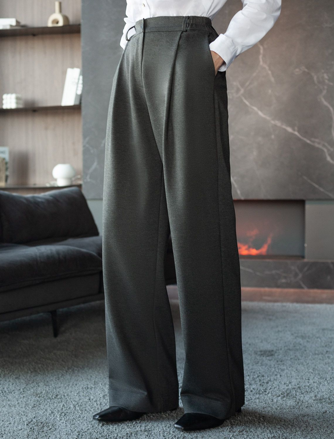 Брюки-палаццо выполнены из ткани джерси. Свободная модель дополнена карманами и поясом на резинке сзади. Посадка на талии и заутюженные стрелки визуально удлиняют ноги и вытягивают силуэт. Идеальный вариант для офисного дресс кода или в повседневный классический стиль.