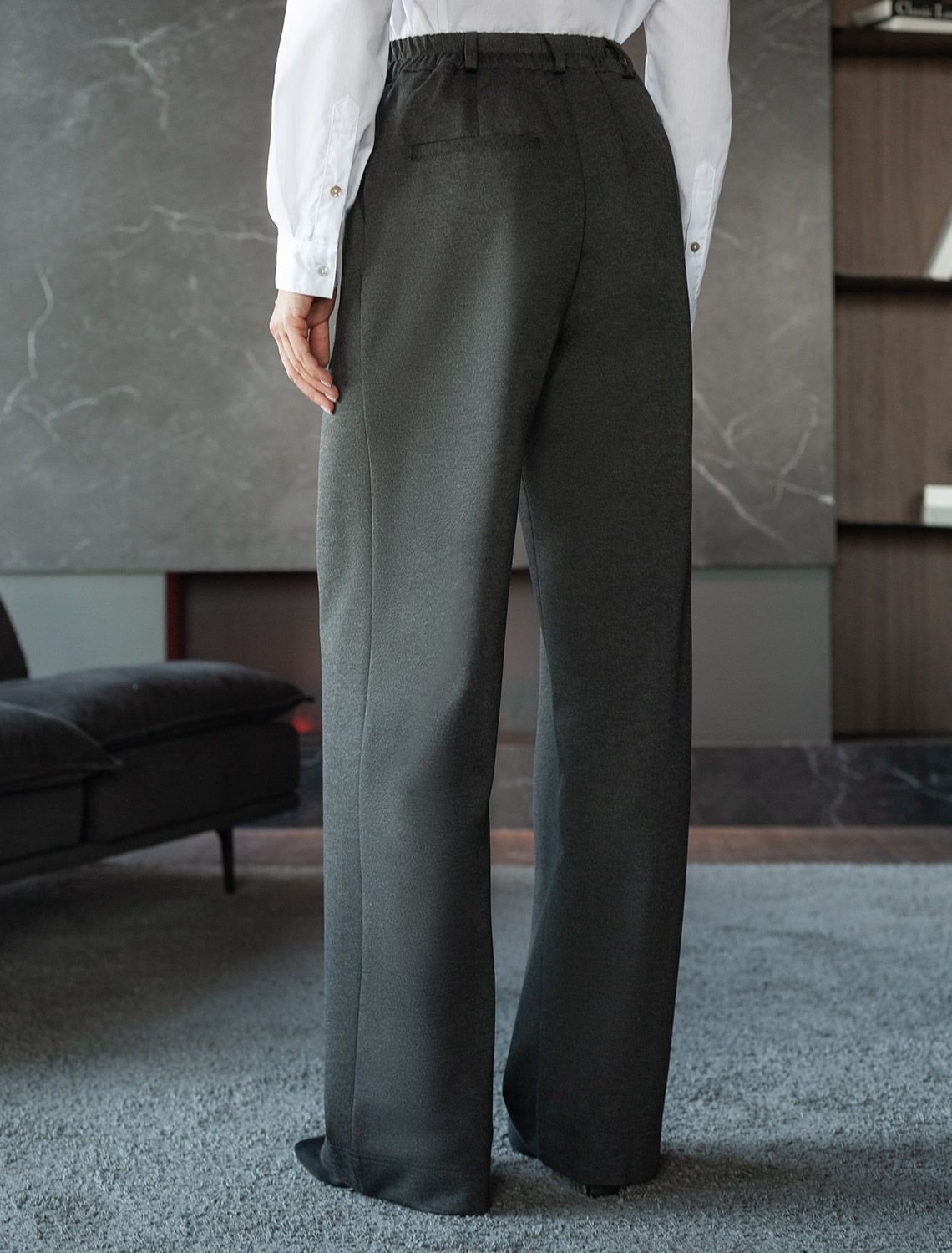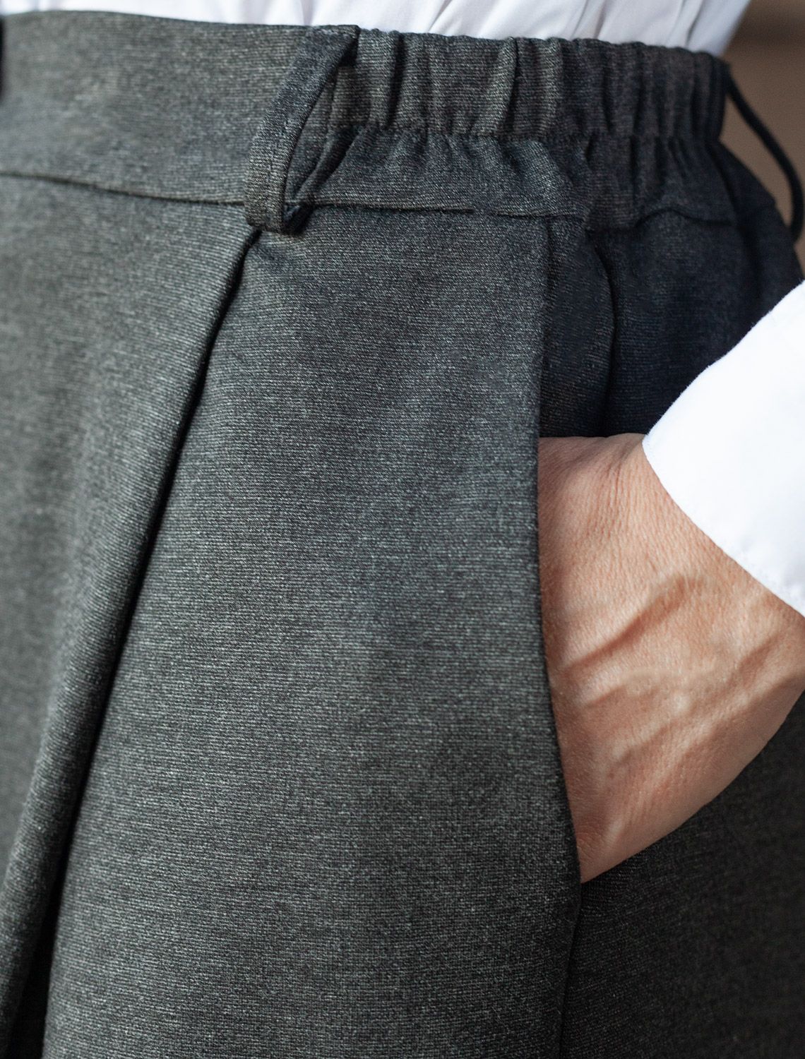 Брюки-палаццо выполнены из ткани джерси. Свободная модель дополнена карманами и поясом на резинке сзади. Посадка на талии и заутюженные стрелки визуально удлиняют ноги и вытягивают силуэт. Идеальный вариант для офисного дресс кода или в повседневный классический стиль.