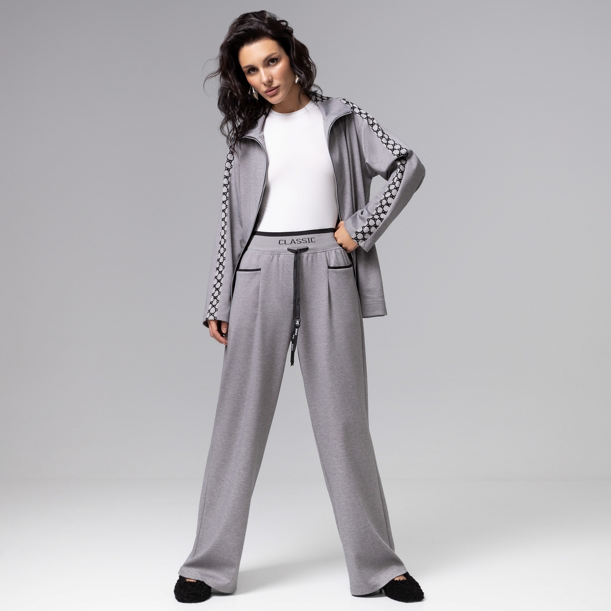 Эти брюки не просто дополняют образ – они диктуют ритм вашему дню. Мягкая ткань играет с пространством, превращая обычную походку в танец. Модель с интегрированными карманами на передней стороне сохраняет безупречную чистоту кроя, подчеркивая сдержанную элегантность. Широкая трикотажная резинка на поясе обеспечивает комфорт и современный вид, идеально контрастируя с благородным серым оттенком ткани.