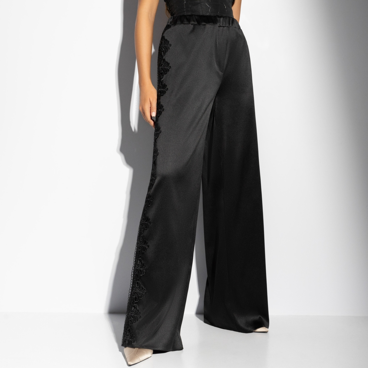 Брюки и корсетный топ – твой чит-код для стильной новогодней вечеринки. А для создания суперэффектных повседневных луков сочетай атлас с офисными рубашками. Как Дуа Липа в своих смелых образах: чем более дерзкий микс, тем круче будет результат! Нарядные широкие брюки с лампасами из кружевной ленты. Брюки на резинке, без карманов. Визуально удлиняют силуэт.