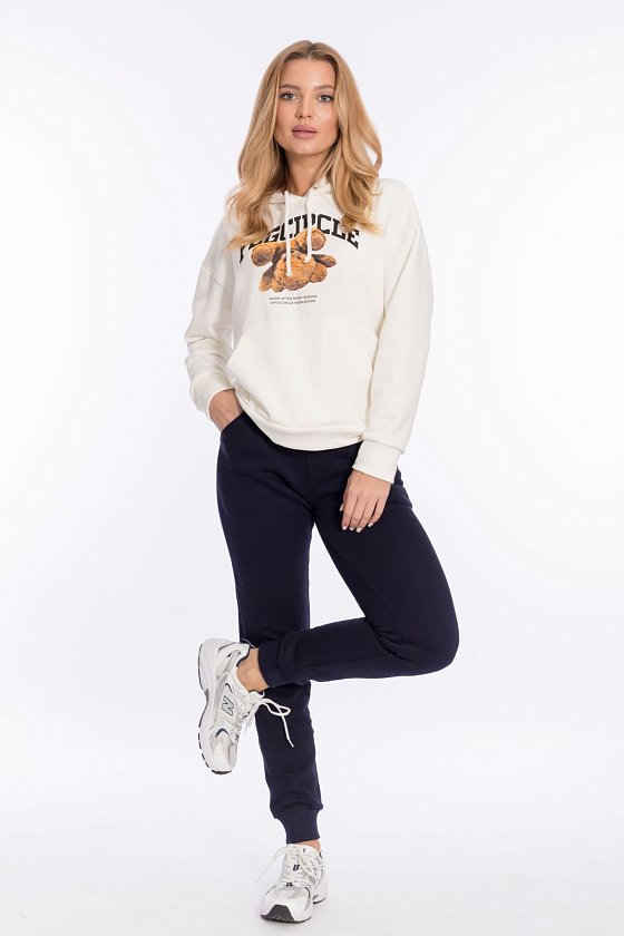Брюки женские из полотна с начёсом. Низ брюк на манжетах, пояс на резине со шнуром, по бокам расположены карманы.