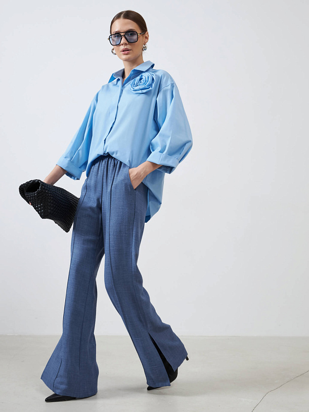 Пояс на резинке создает идеальную посадку, обеспечивает комфорт в течение всего дня. Внизу брючин у акцентные разрезы, добавляющие легкости и динамичности вашему образу. Этот стильный элемент делает эти брюки не только удобными, но и актуальными в мире моды.