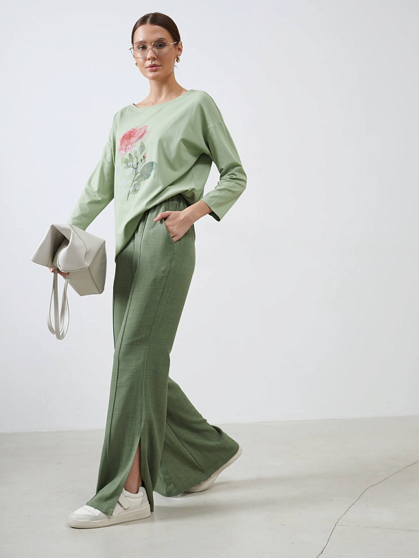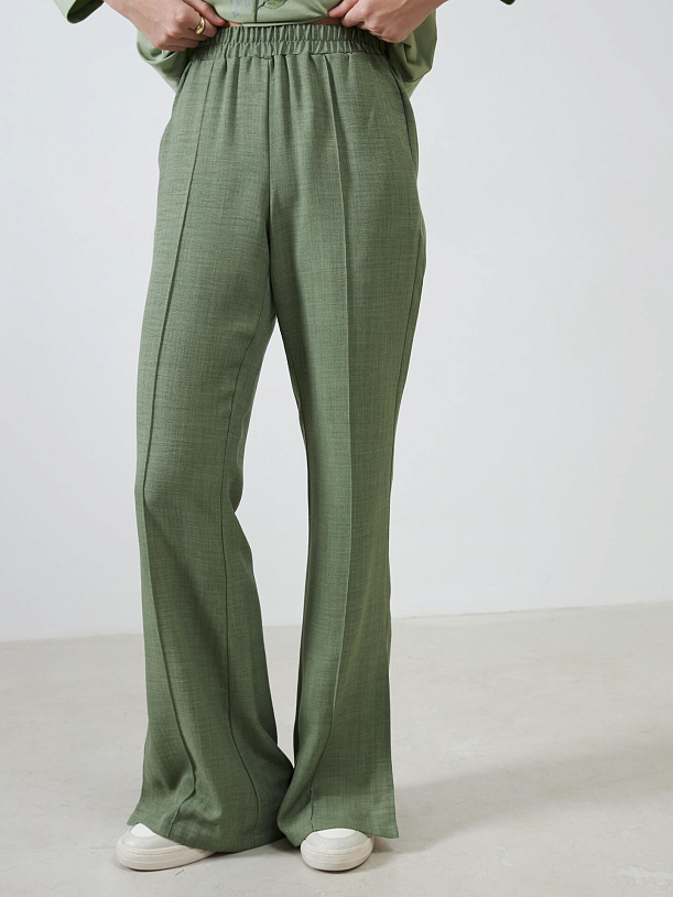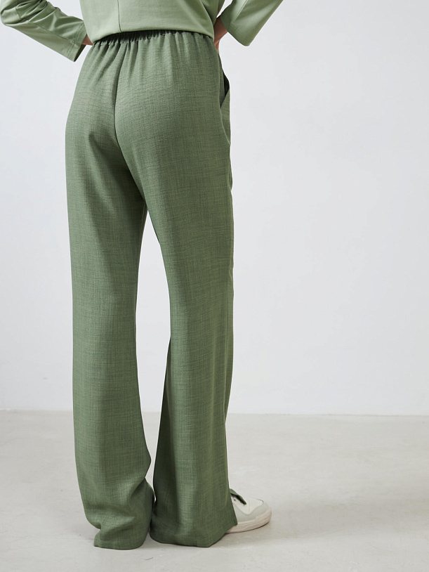 Пояс на резинке создает идеальную посадку, обеспечивает комфорт в течение всего дня. Внизу брючин у акцентные разрезы, добавляющие легкости и динамичности вашему образу. Этот стильный элемент делает эти брюки не только удобными, но и актуальными в мире моды.