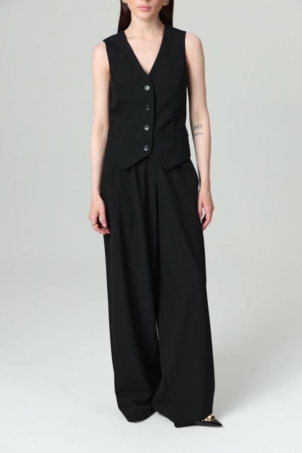 Брюки-палаццо из костюмной поливискозы. Модель свободного силуэта на притачном поясе со шлёвками. По спинке резинка. По переду карманы, защипы и застежка-гульфик.