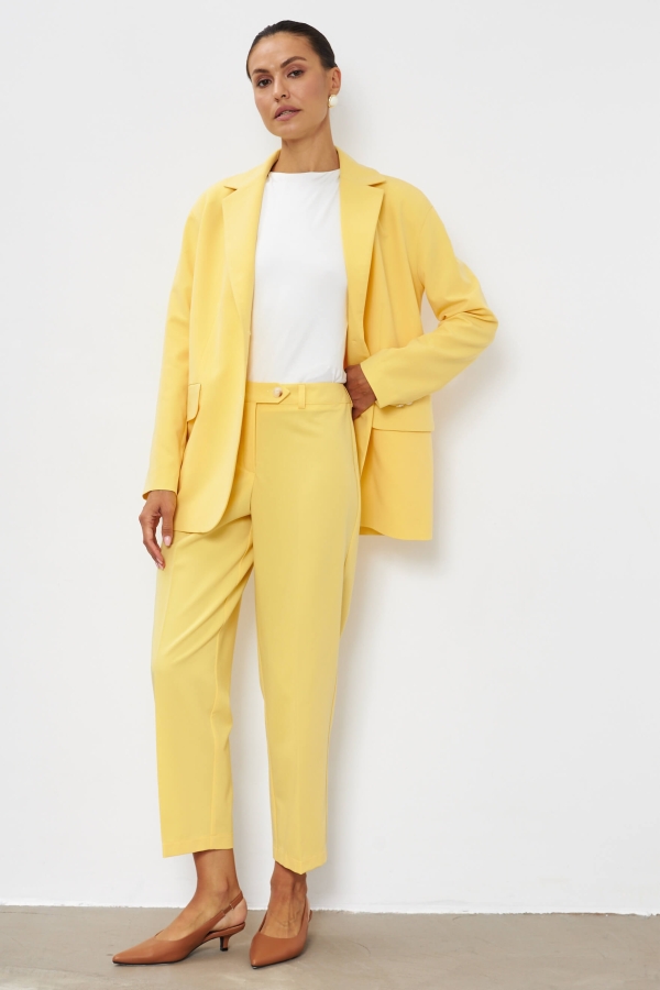 Классические брюки средней посадки. Модель укороченная, на средней посадке. Брюки прямые и слегка зауженные к низу. По переду гульфик, застежка на молнию и пуговицу.