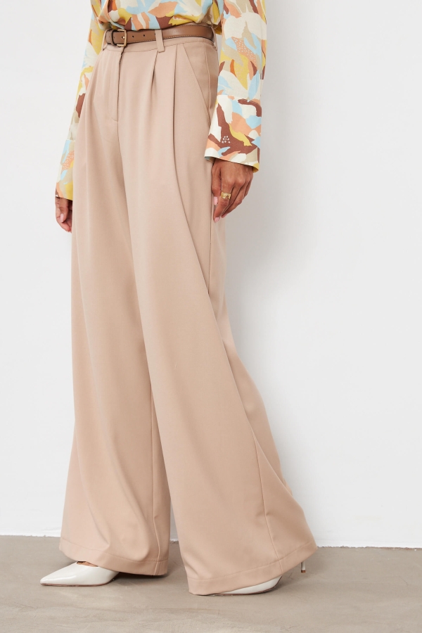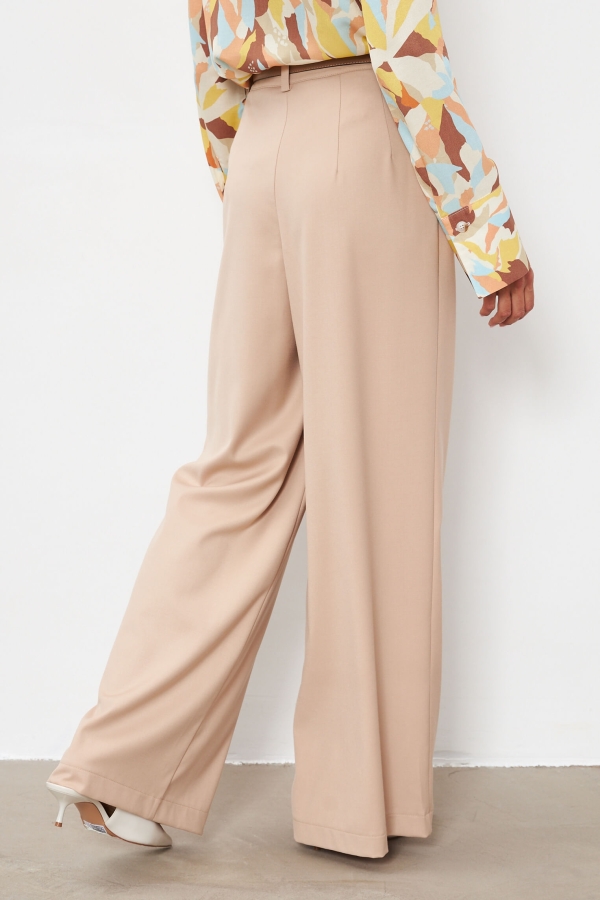 Брюки-палаццо из костюмной поливискозы. Прямые свободные брюки с высокой посадкой. Модель расширена к низу, со шлевками и боковыми карманами.