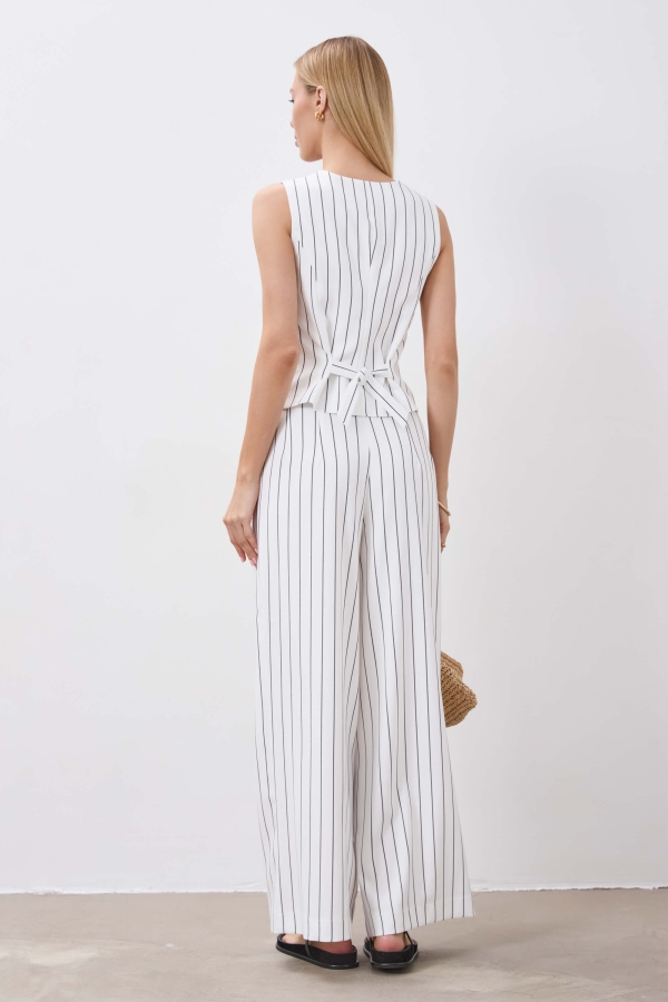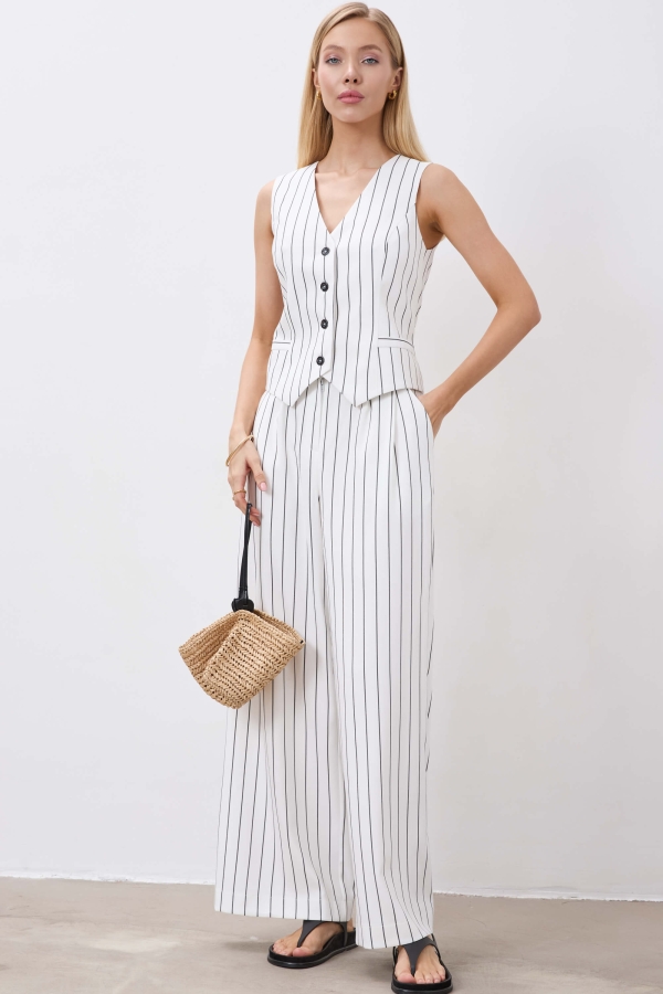 Брюки-палаццо из костюмной поливискозы. Прямые свободные брюки с высокой посадкой. Модель расширена к низу, со шлевками и боковыми карманами.