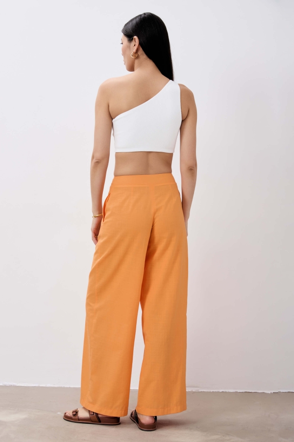 Модель свободного силуэта с асимметричным элементом по переду. Средняя посадка на притачном поясе. В боковом шве карманы. Застежка гульфик с пуговицей.