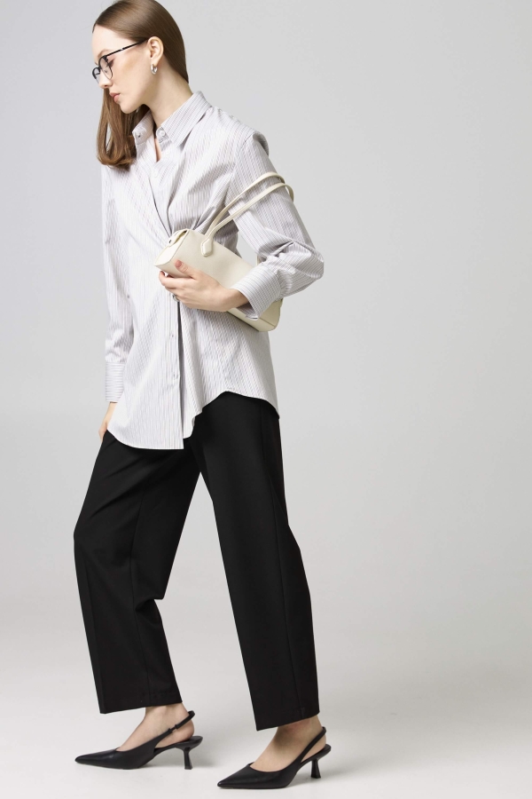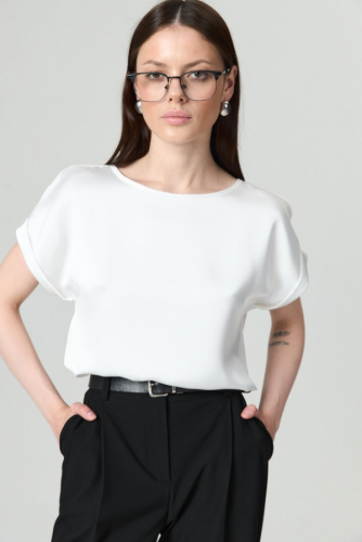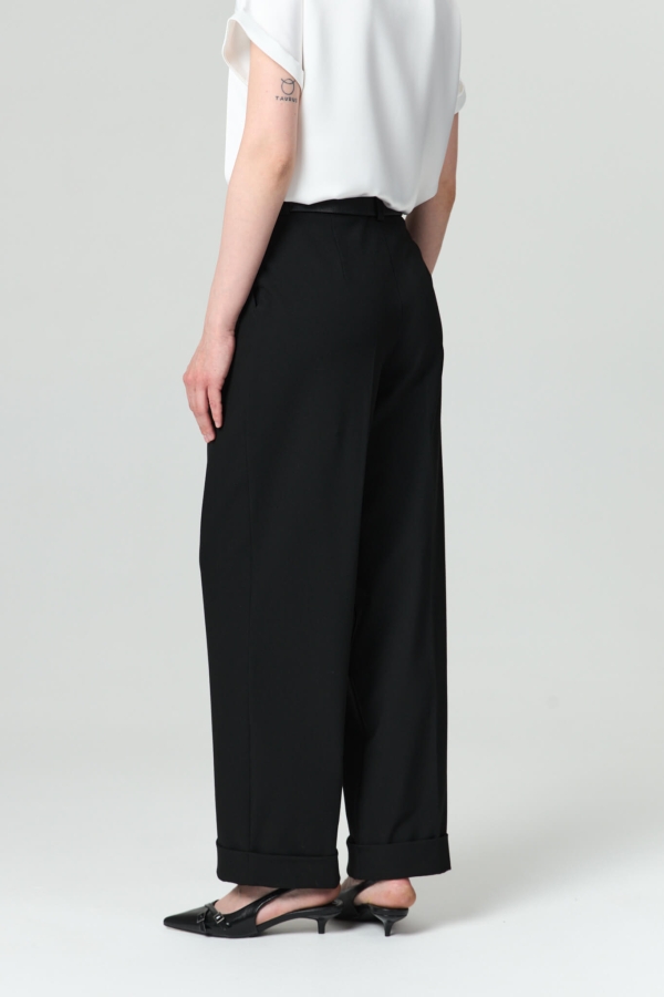 Укороченные брюки с манжетами. Модель свободного силуэта, зауженная к низу со стрелками. Пояс притачной со шлевками,посадка средняя. По переду карманы. Застежка гульфик на хлястик с пуговицей.