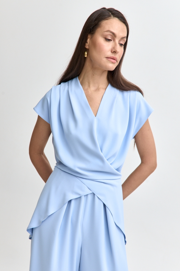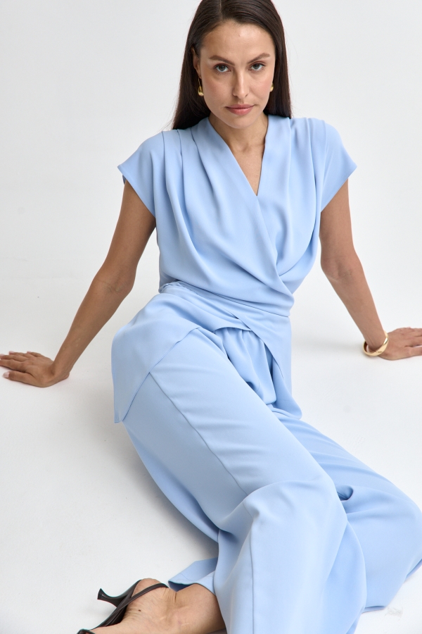 Элегантный комбинезон нежно-голубого оттенка. Модель полуприлегающего силуэта. По переду V–вырез, по плечам складки и декоративные элементы регулируемого запаха с завязками переходящими на спинку. По спинке застежка на молнию. Линия талии укреплена резинкой.