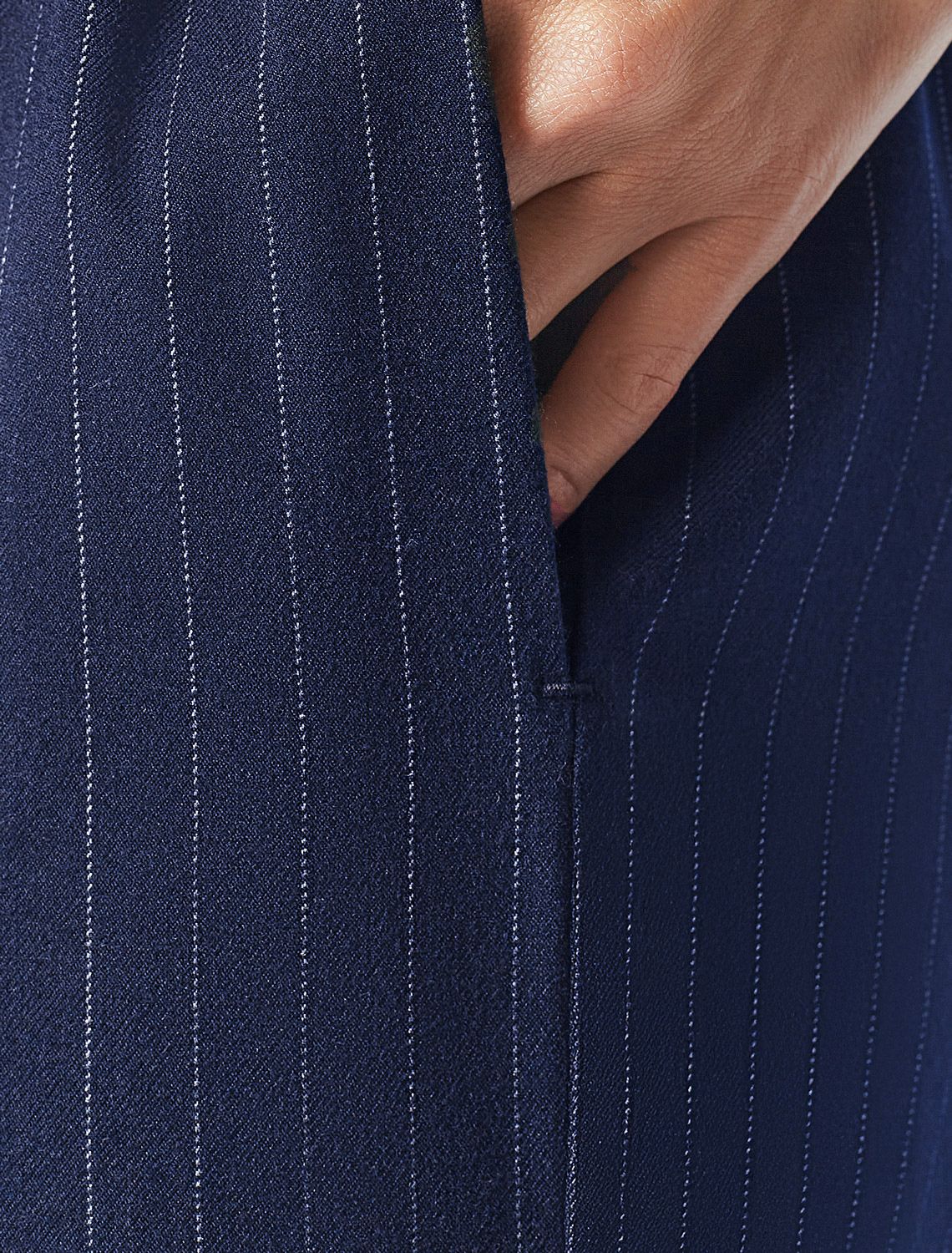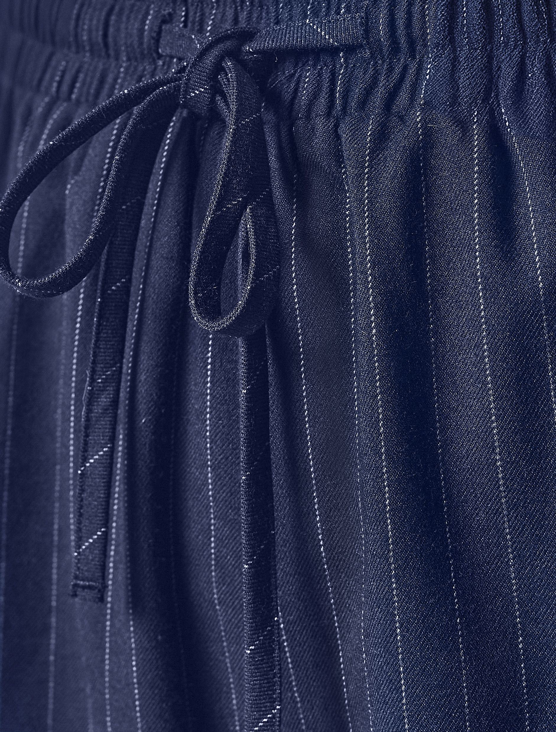 Брюки свободного кроя выполнены из костюмной ткани в полоску. Модель с карманами и поясом на резинке дополнена регулируемым шнурком из основной ткани. Изделие не сковывает движений и подходит для любого типа фигуры. Сочетается в костюме с жилетом D27.001