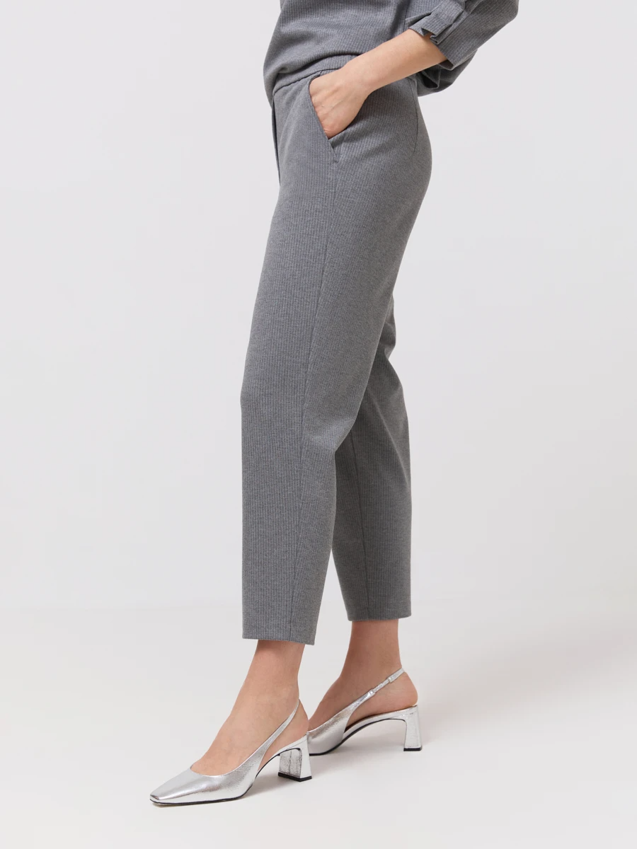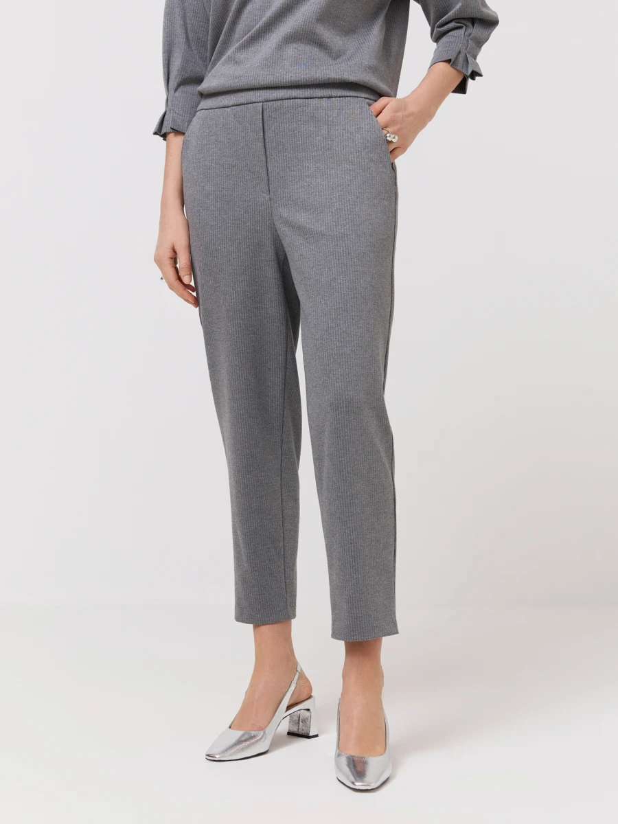 Укороченные брюки из мягкого трикотажа серого цвета — это комфортный и элегантный вариант для повседневного гардероба. Модель выполнена из приятного на ощупь материала с высоким содержанием вискозы и нейлона, благодаря чему изделие сохраняет форму и обладает лёгкой эластичностью. Прямой крой с зауженными к низу штанинами визуально вытягивает силуэт, а классическая посадка делает брюки универсальными для различных типов фигуры.