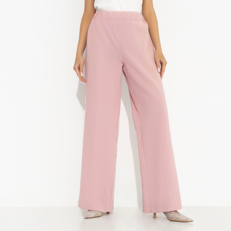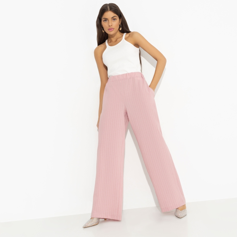 Зимой и летом, весной и осенью, в любую погоду и при любой модной повестке, брюки в розовом цвете будут актуальны. Нежность и элегантность выходят за пределы трендов, навсегда врезаясь в память окружающим. Брюки прямые в тонкую полоску. Посадка на талии. Пояс оформлен скрытой резинкой. Есть карманы.