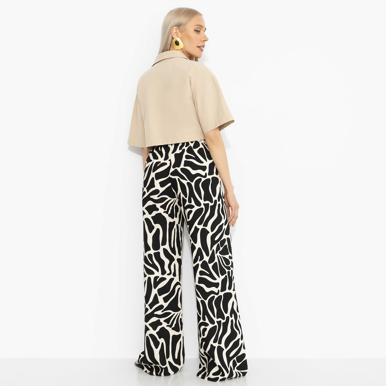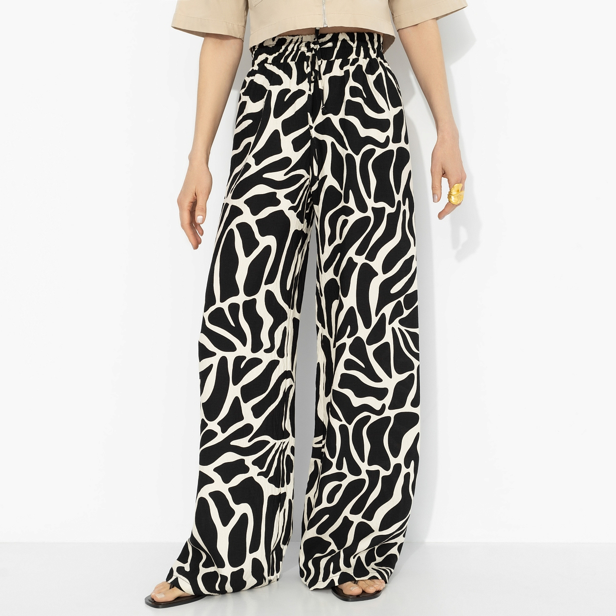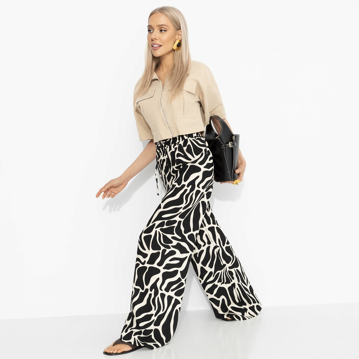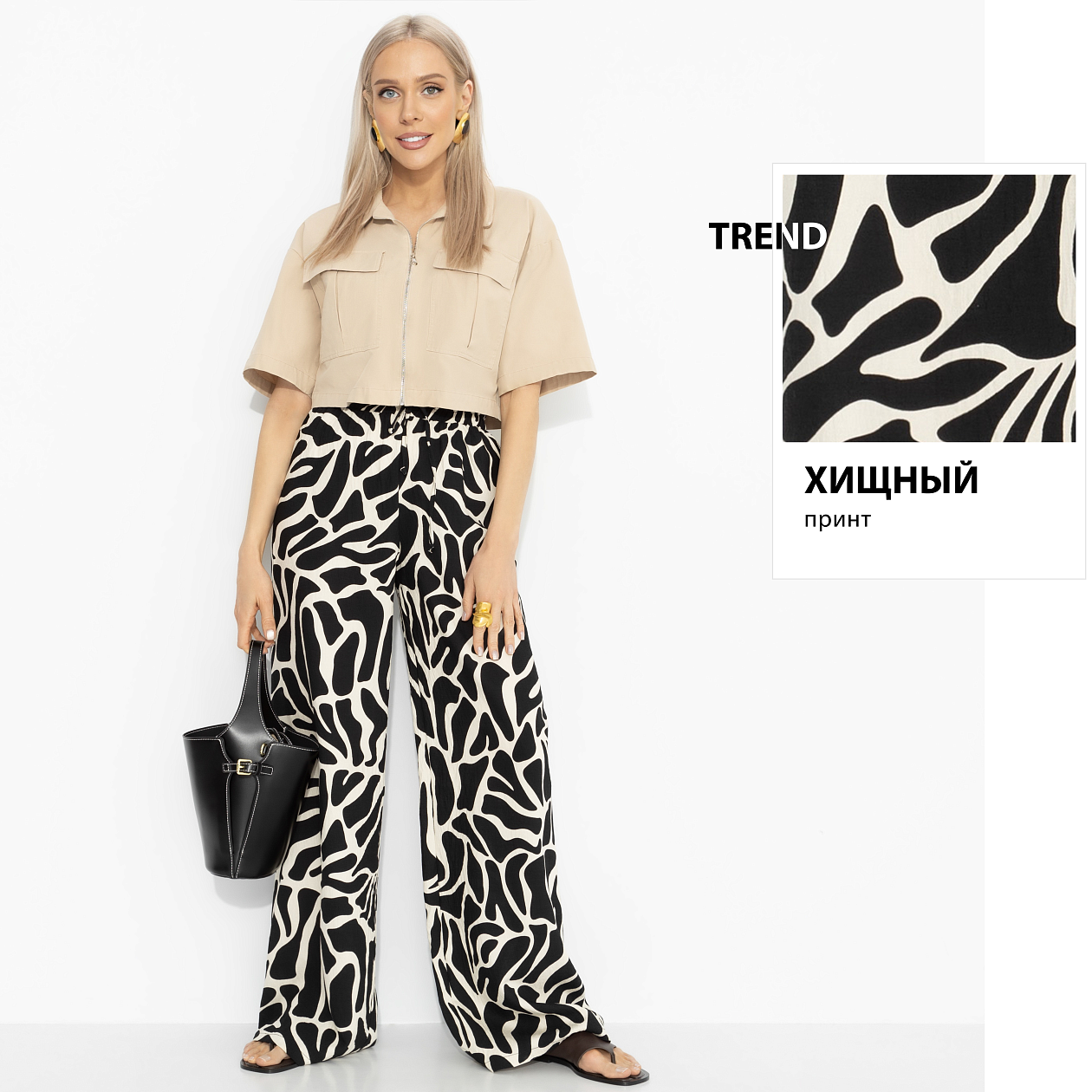 «Возьми телефон, детка. Я знаю, ты хочешь позвонить мне сегодня». С такой же уверенностью новые брюки выстраивают образ — притягивают взгляды и не отпускают. Графичный принт, свободный силуэт и ощущение модной свободы. Носите с лаконичным верхом — главный акцент уже сделан. Модель свободного кроя выполнена из вискозной ткани с добавлением нейлона. Высокая посадка и пояс на комфортной резинке. Лёгкий, струящийся материал с выразительным принтом красив при ходьбе и очень приятен на ощупь.