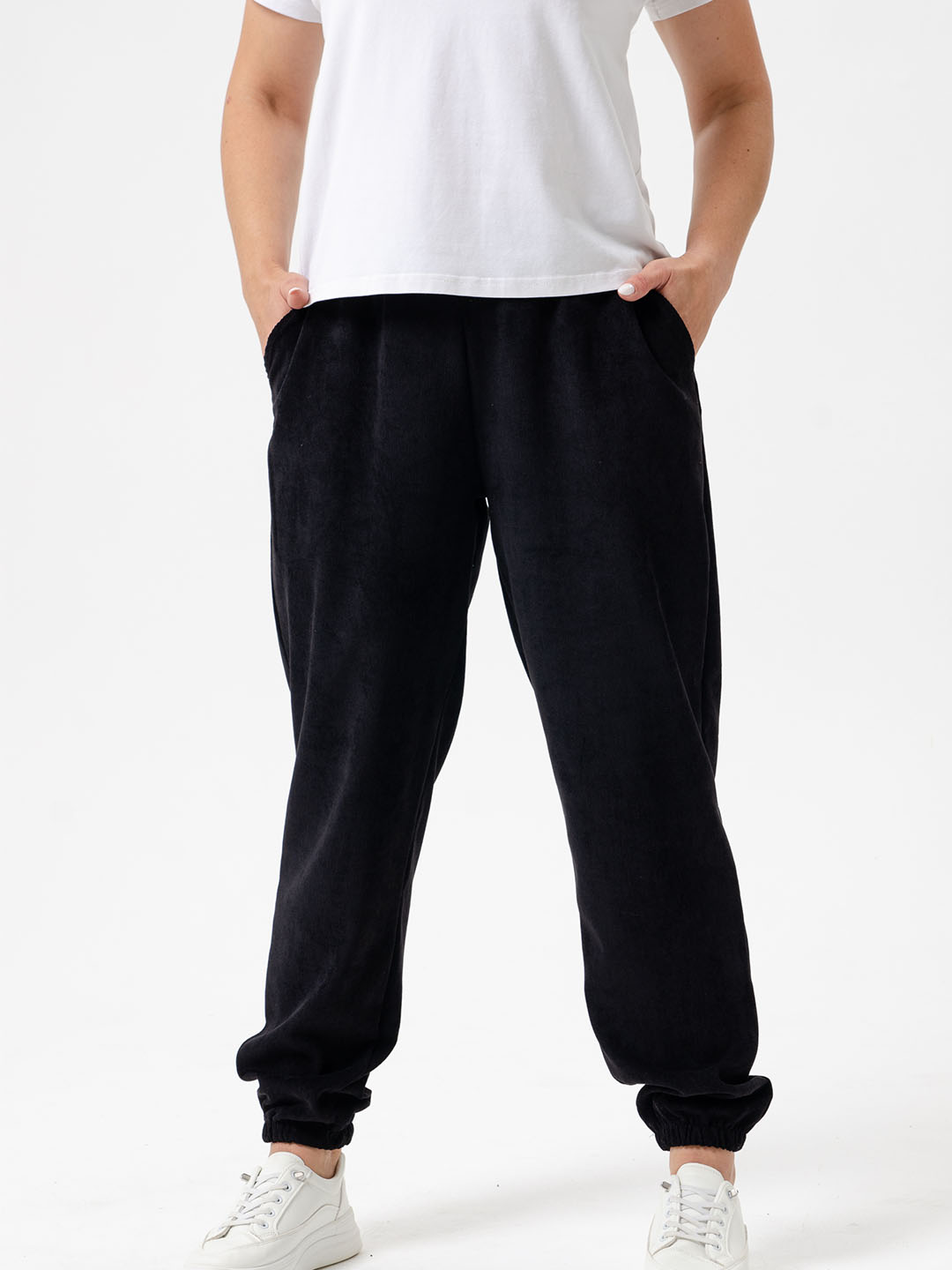 Женские трикотажные брюки черного цвета из мягкого и стильного вельвета - идеальный выбор для создания элегантного образа. Они отлично сидят по фигуре, обеспечивают комфорт и подчеркивают женскую красоту. Носите их как с повседневной блузой, так и с праздничным топом - эти брюки подойдут к любому наряду!