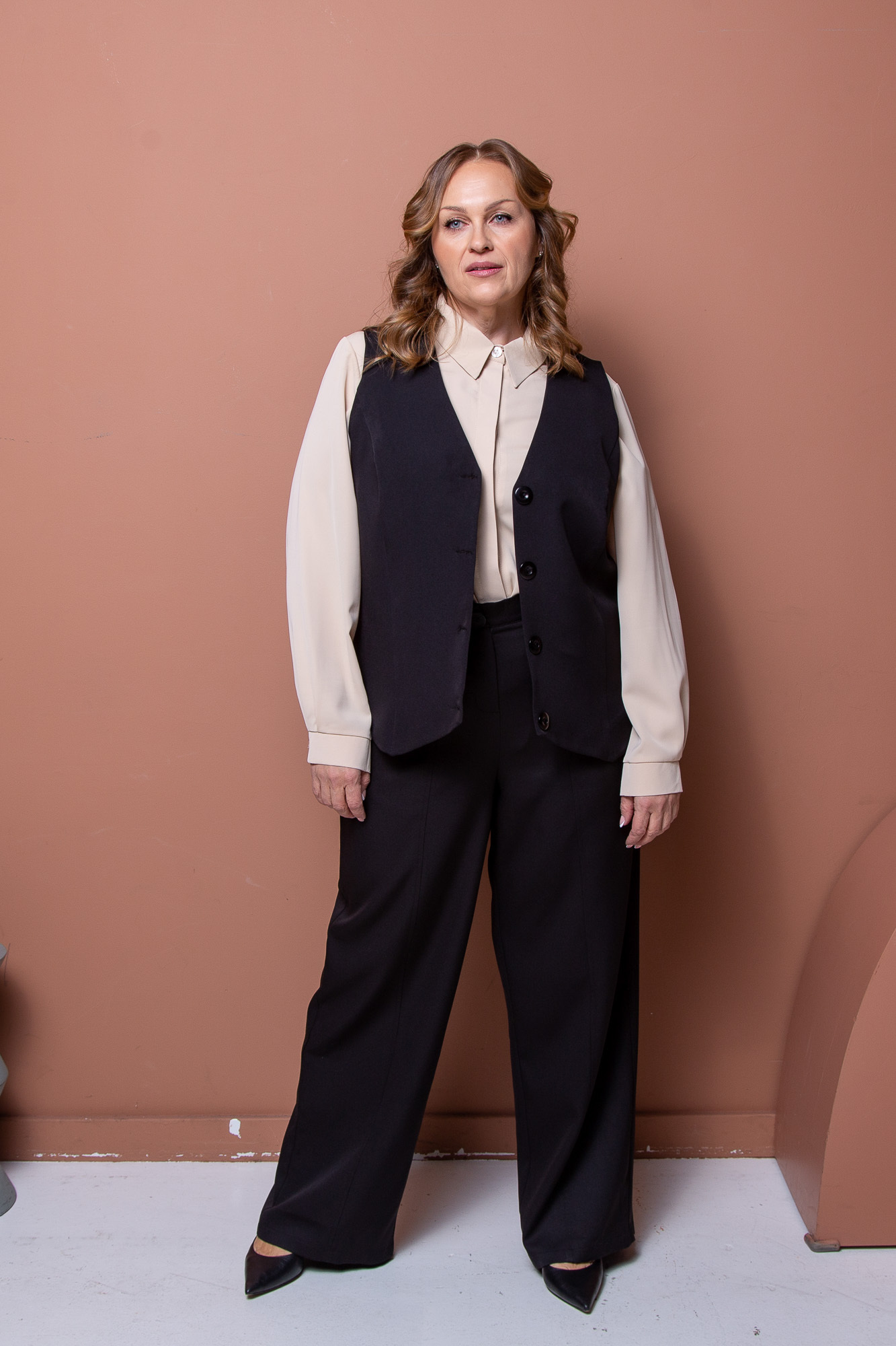 Состав: 65% полиэстер, 30% вискоза, 5% эластан. Цвет: черный. Ткань: костюмка. Покрой: прямой. Подклад: нет. Длина изделия: до щиколотки. По центру передней половины брюк рельефный настроченный шов. Пояс притачной, с эластичной тесьмой по спинке, застежка центральная на молнию в гульфике и петлю-пуговицу на поясе.