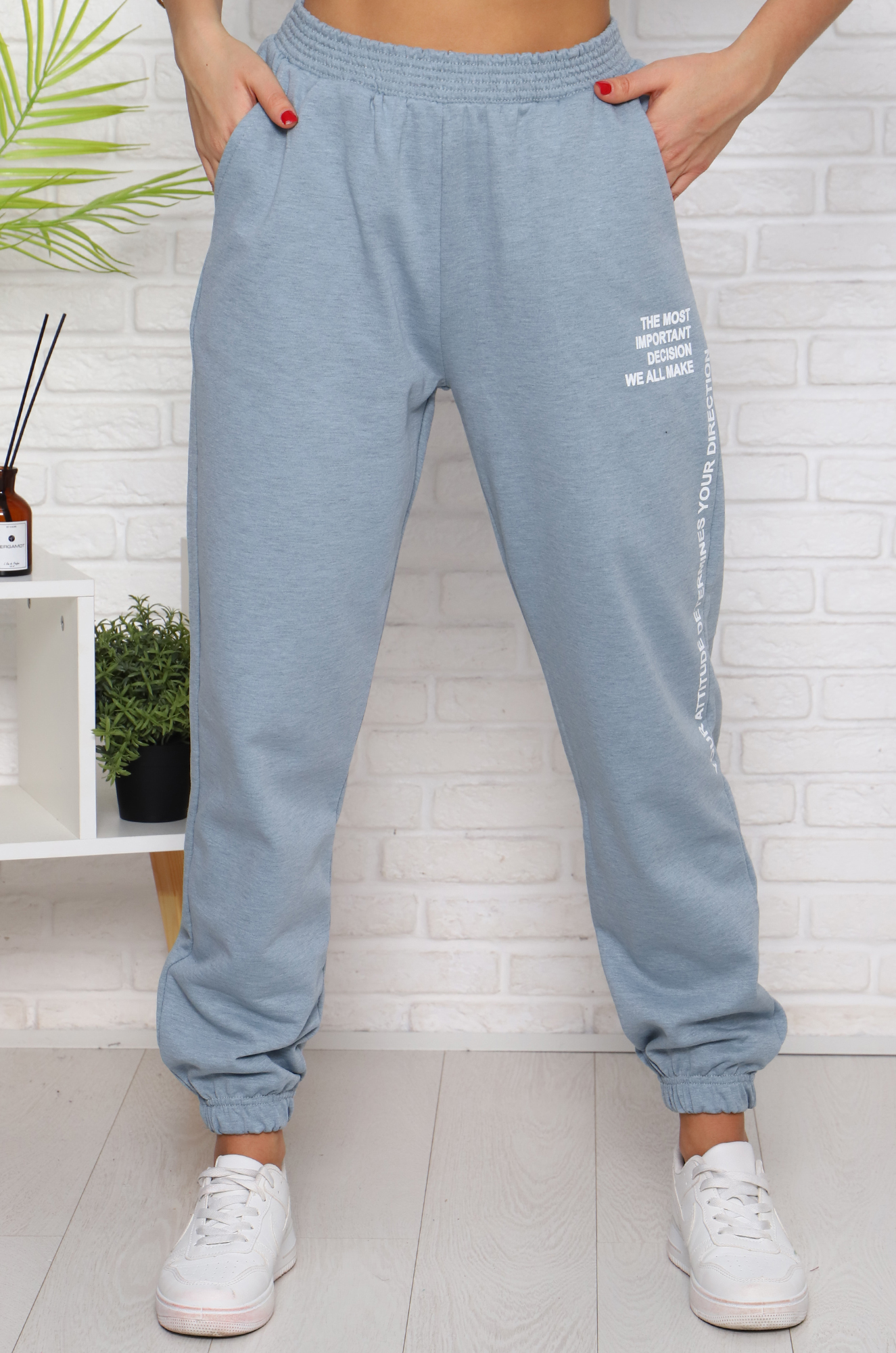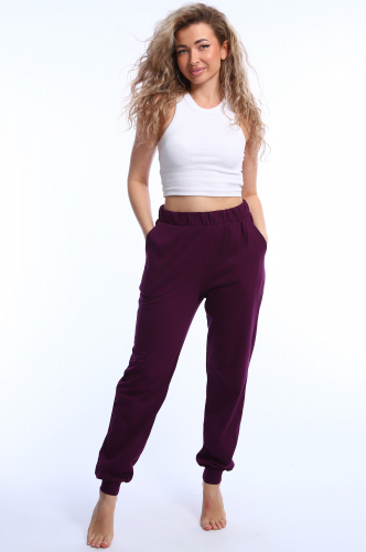 Удобные спортивные женские брючки для активного отдыха или для дома. Модель комфортного, свободного кроя, снизу на широкой резинке, с боковыми карманами, пояс прострочен на спец.машине. Дополняет модель стильная печать по ноге.