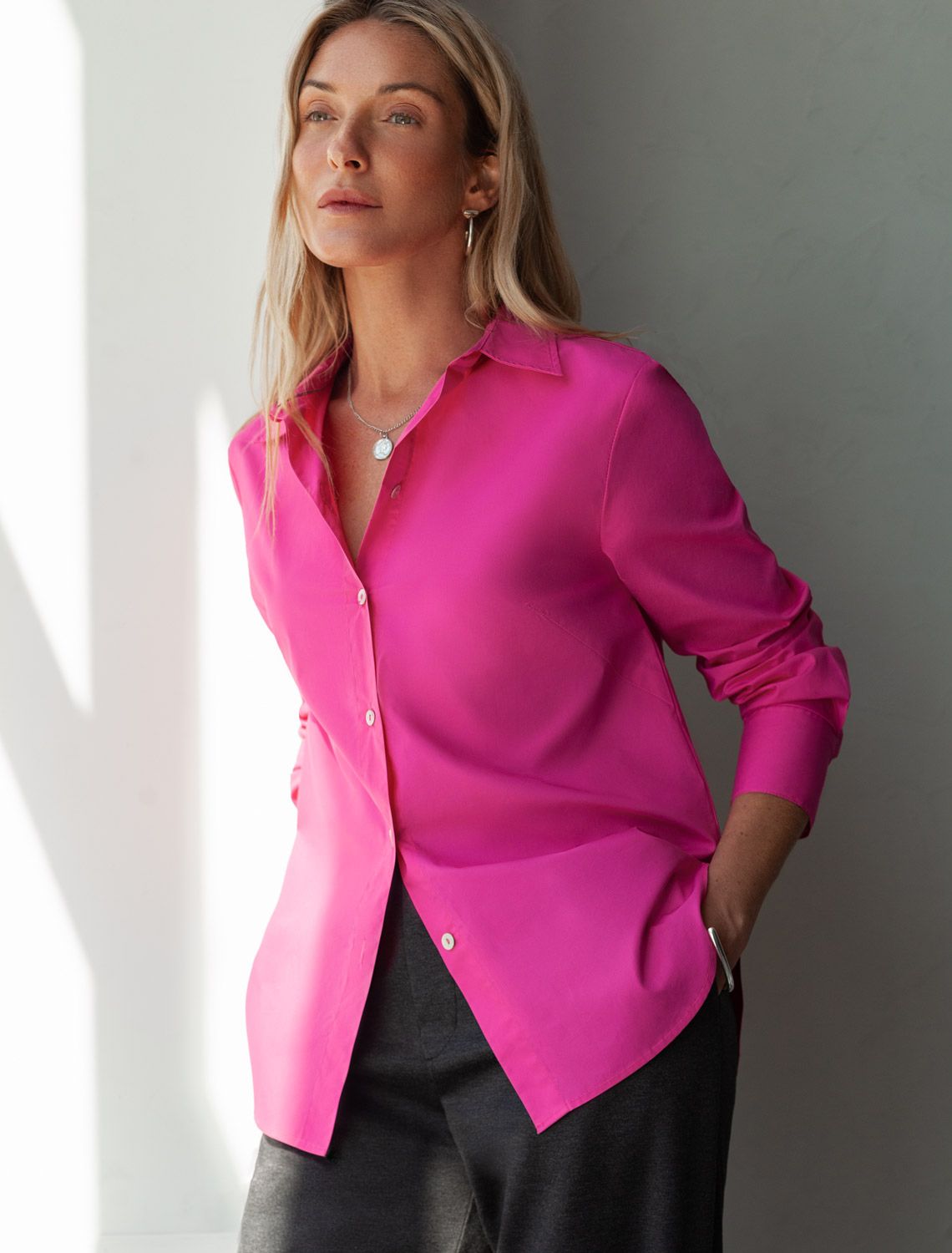 Рост 172, бюст 88, талия 64, бедра 88 Блузка выполнена из премиального хлопкового поплина Лаконичная модель с высокими манжетами и пуговицами из натурального перламутра хорошо впишется в любой гардероб и внесет яркий летний акцент в образ. Натуральный состав ткани обладает высокой воздухопроницаемостью и гигроскопичностью. В изделии будет комфортно, даже в самое жаркое время года. Подходит для любой фигуры. На спинке фирменный логотип бренда.