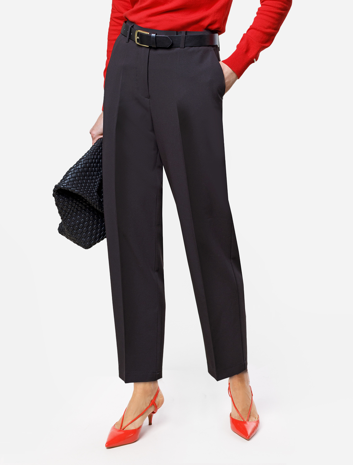 Рост 172, бюст 88, талия 64, бедра 88 Укороченные брюки выполнены из фактурной черной поливискозы. Модель дополнена боковыми карманами и отлично подойдет как для строгого делового образа с блузкой и жакетом, так и для более расслабленного с футболкой и водолазкой. Эластичный материал изделия поддерживает оптимальный микроклимат, формоустойчивость и комфорт в течение всего дня.