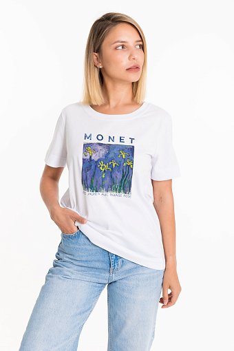 Футболка из кулирки с лайкрой с коротким втачным рукавом. Круглый вырез горловины с притачной планкой. Спереди нанесён принт.