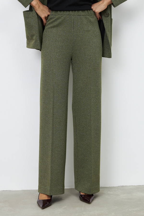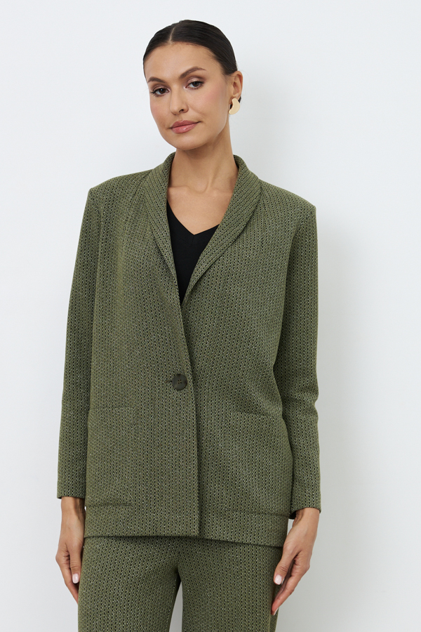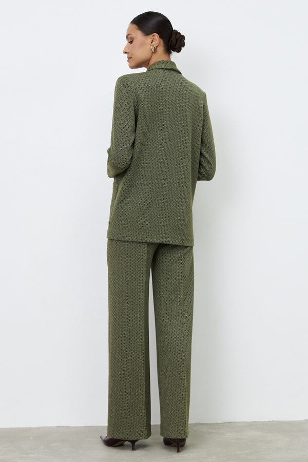 Костюм из эластичного полотна. Брюки прямого силуэта. Пояс с эластичной резиной. Жакет прямого свободного кроя с женственным шалевым воротником. На передней части изделия застёжка на пуговицу и накладные карманы. Втачной рукав. Изделие с плечевыми накладками, которые при желании можно убрать.