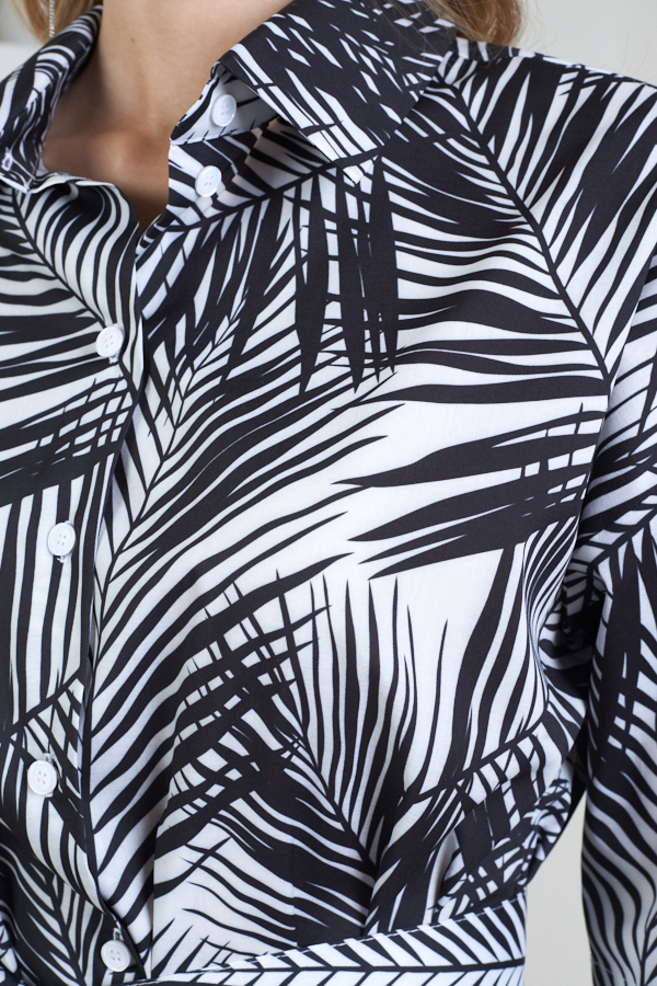Платье-рубашка из вискозной ткани свободного силуэта, с застёжкой на пуговицы. Короткий втачной рукав в спущенную пройму. Вырез горловины обработан отложным воротником на стойке. На передней части изделия выполнены накладные карманы. В комплекте пояс из основной ткани.