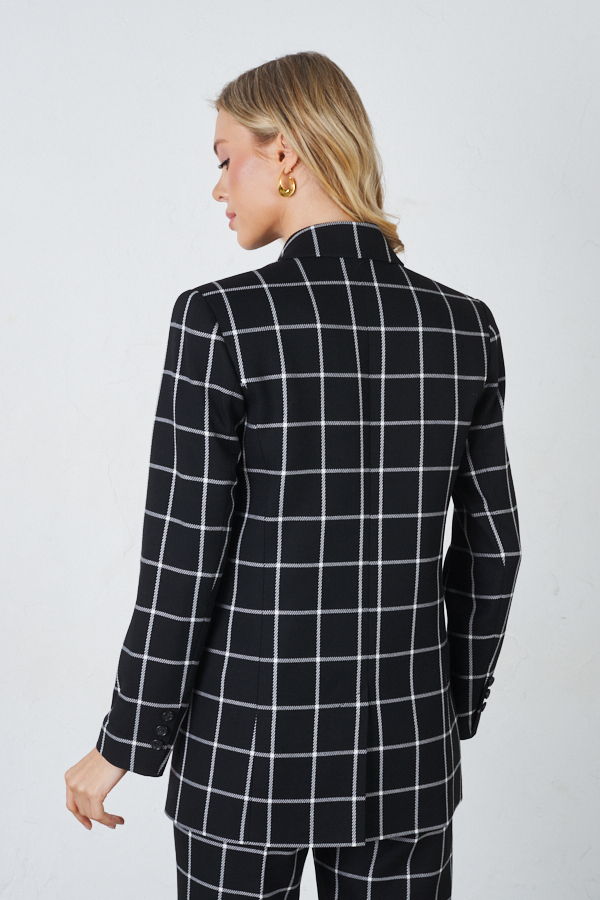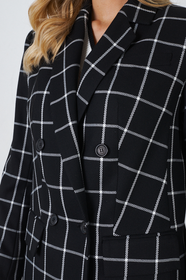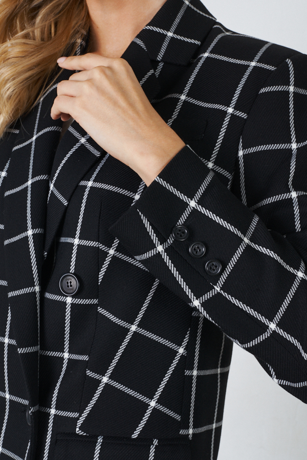Двубортный жакет из костюмной ткани. Изделие полуприлегающего силуэта с английским воротником и застежкой на пуговицы. На передней части жакета выполнен нагрудный карман с листочкой и карманы в рамку с клапаном. По центру задней части выполнена шлица - элемент декоративный и необходимый. Обеспечивает свободу движения, добавляет шику и элегантности. Втачной длинный рукав, снизу имитация шлицы с пуговицами. Изделие идеально держит форму, имеет четкую линию плеча благодаря плечевым накладкам. Жакет на подкладке.