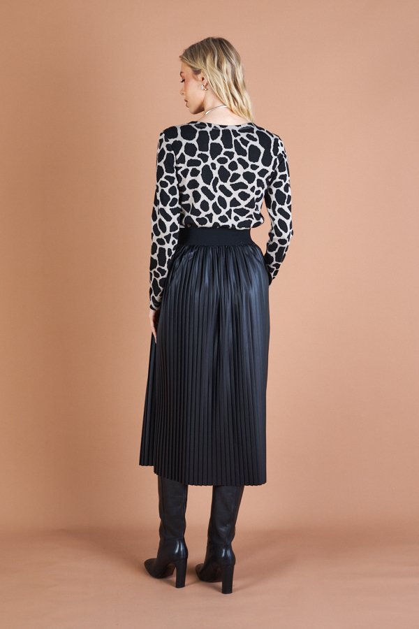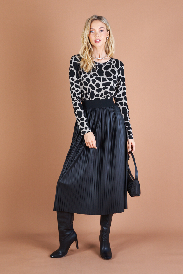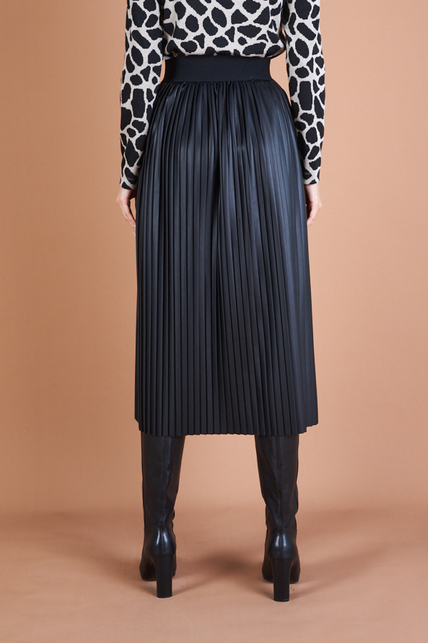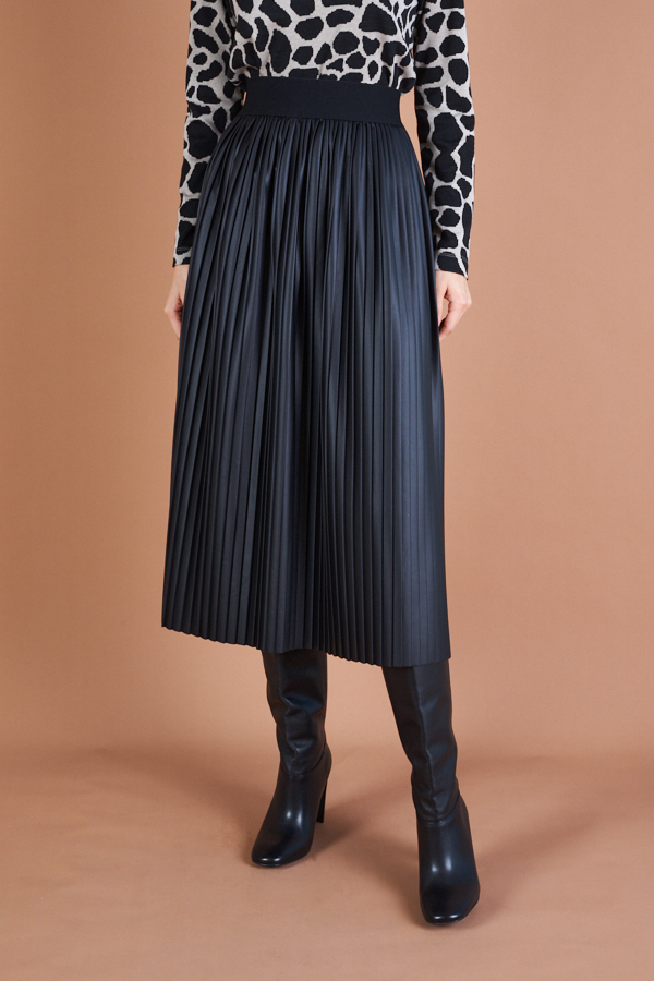 Юбка с эффектом "гофре" из эластичного полотна с накатом, имитирующим кожу. Летящий силуэт. Пояс из эластичной декоративной резины обеспечивает хорошую посадку по фигуре.