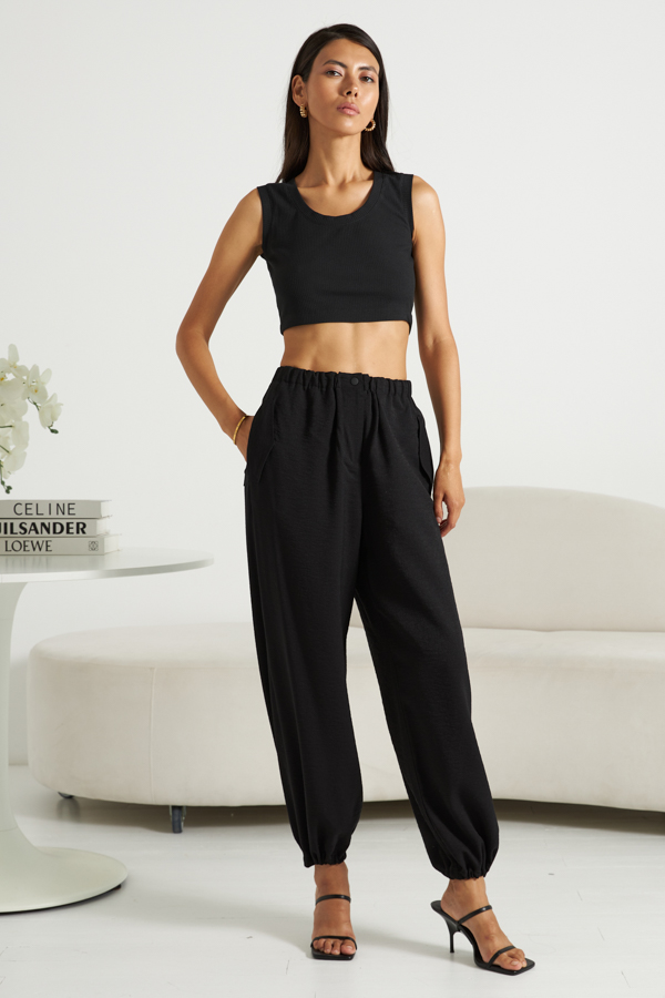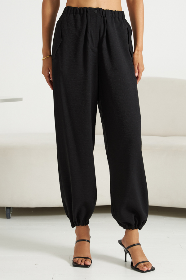 Брюки прямого силуэта из вискозной ткани с крэш-эффектом. В боковых швах выполнены карманы с клапанами. Застёжка на молнию-гульфик и кнопку. На задней части изделия накладной карман с клапаном. Нижний срез брюк оформлен кулиской. Пояс с эластичной резиной и кулиской.