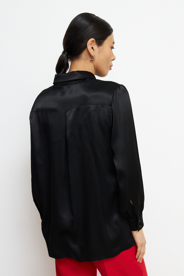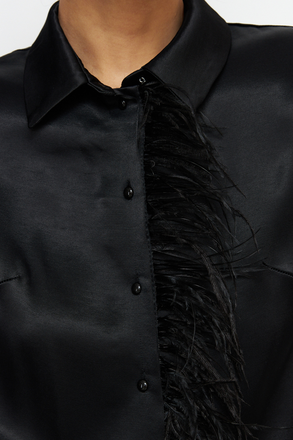Блуза из вискозной ткани с сатиновым блеском. Свободный силуэт с разрезами в боковых швах и застёжкой на пуговицы. На задней части изделия выполнена кокетка с небольшой складкой. Вырез горловины обработан отложным воротником на стойке. Втачной рукав на манжете с застёжкой на пуговицы. Изделие украшено съемной планкой с перьями. Перед стиркой планку с перьями необходимо снять.