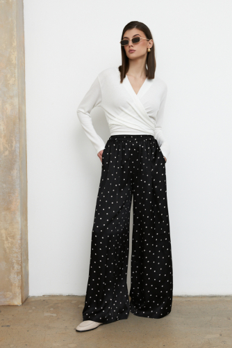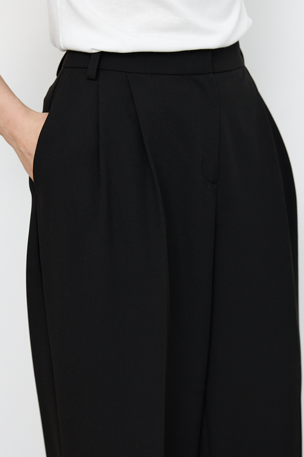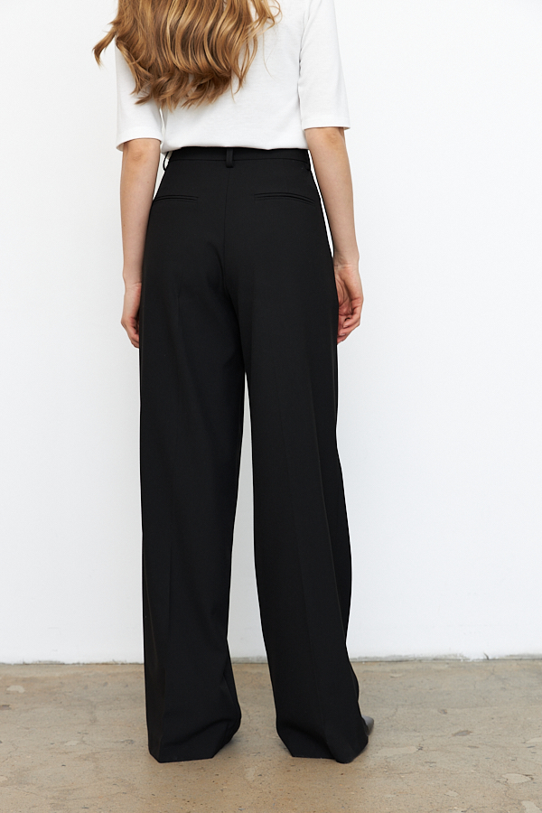 Брюки свободного силуэта из меланжевой костюмной ткани. На передней половинке выполнены карманы с подкройным бочком, по линии талии заложены складки. На задней половинке - талиевые вытачки и имитация карманов в рамку. Притачной пояс со шлёвками. Застёжка на молнию-гульфик и крючок. Такой крой выгодно подчеркнёт длину ваших ног.