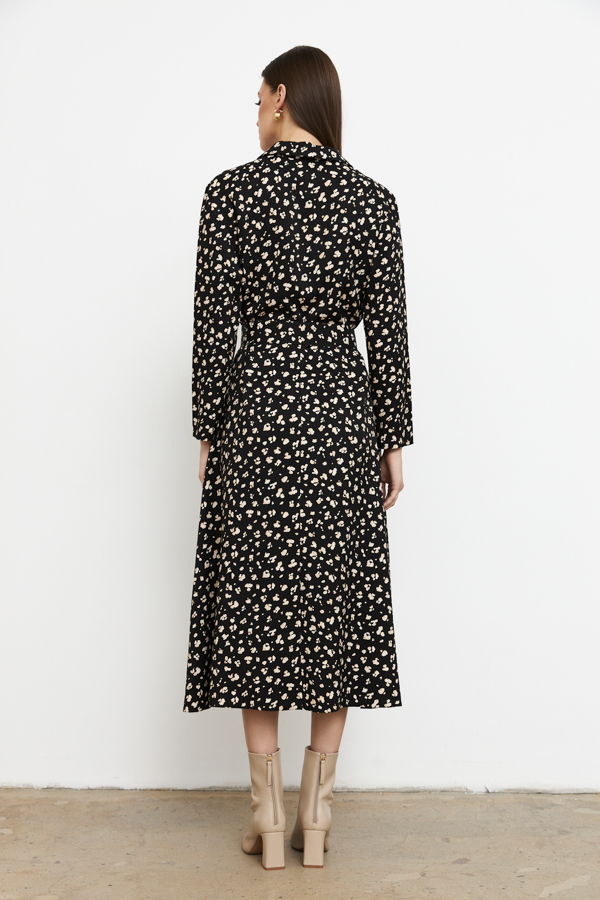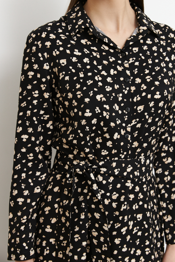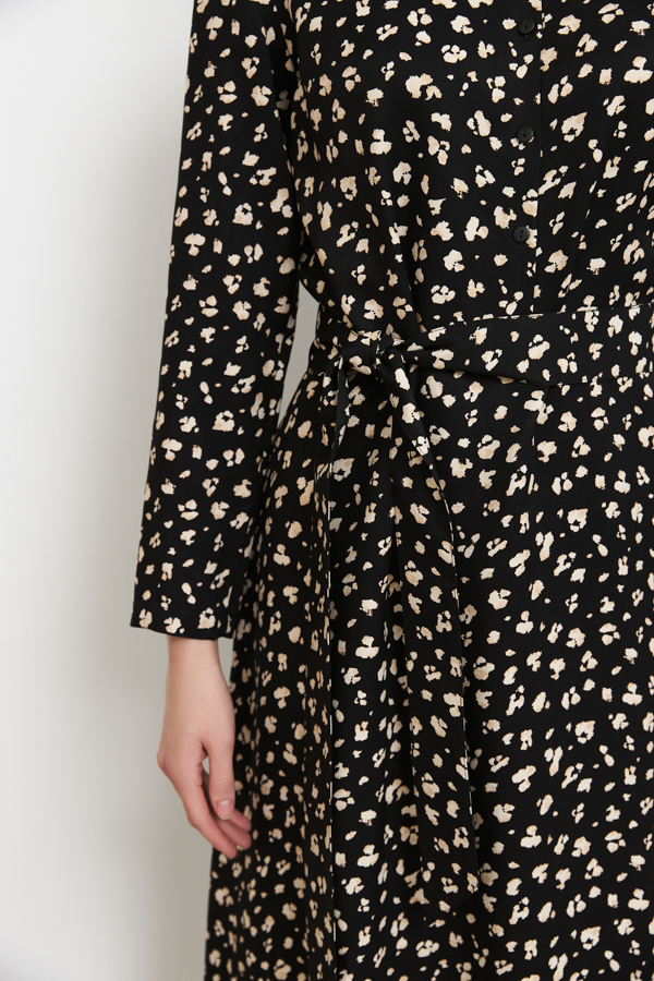 Платье полуприлегающее в области груди и свободное в области бедер из вискозной ткани. Изделие отрезное по линии талии. Лиф с застёжкой на пуговицы. Вырез горловины обработан отложным воротником на стойке. Втачной длинный рукав. В комплекте пояс из основной ткани.
