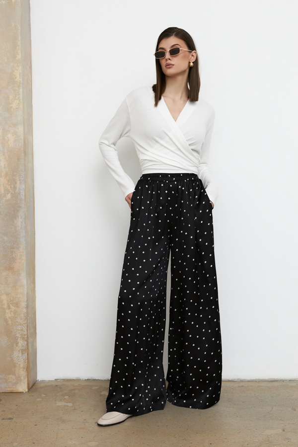 Брюки прямого свободного силуэта из вискозной ткани. Пояс притачной с эластичной резиной, в боковых швах карманы.