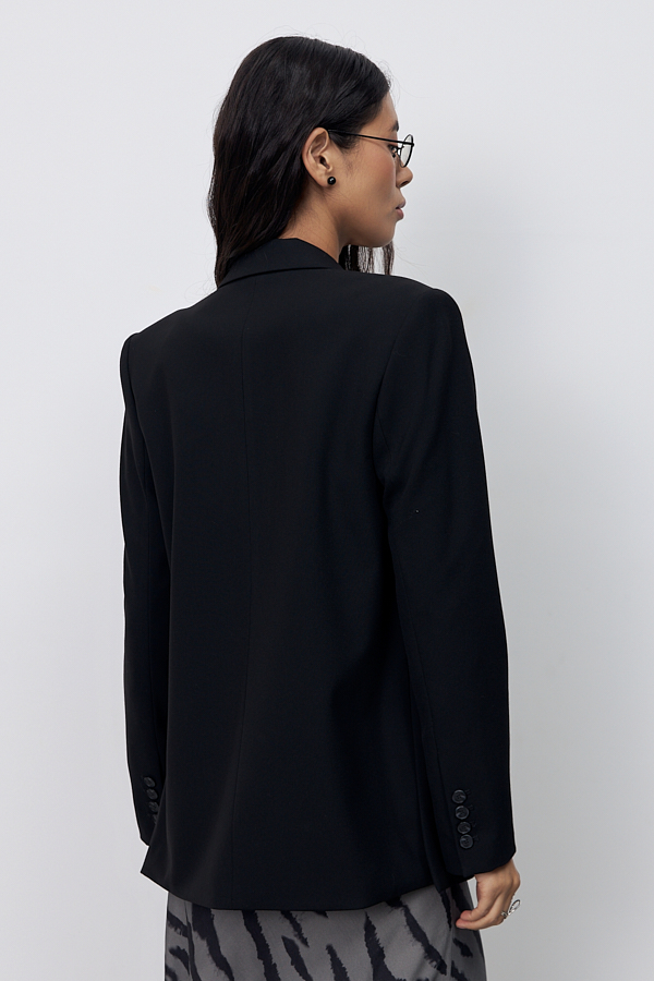 Жакет прямого силуэта с разрезами в боковых швах из костюмной ткани. Изделие с английским воротником и застежкой на пуговицу. На передней части жакета выполнен нагрудный карман с листочкой и карманы в рамку. Втачной длинный рукав, снизу шлица с пуговицами. Изделие идеально держит форму, имеет четкую линию плеча благодаря плечевым накладкам. Жакет на подкладке.