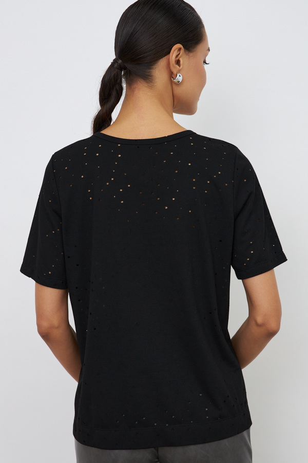 Джемпер из эластичного полотна с перфорацией. Изделие свободного силуэта. Втачной короткий рукав. Вырез горловины окантован эластичной бейкой. Джемпер – это хорошая базовая вещь, подходящая для любого гардероба.