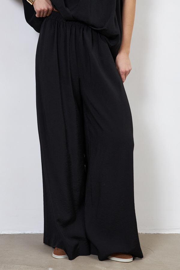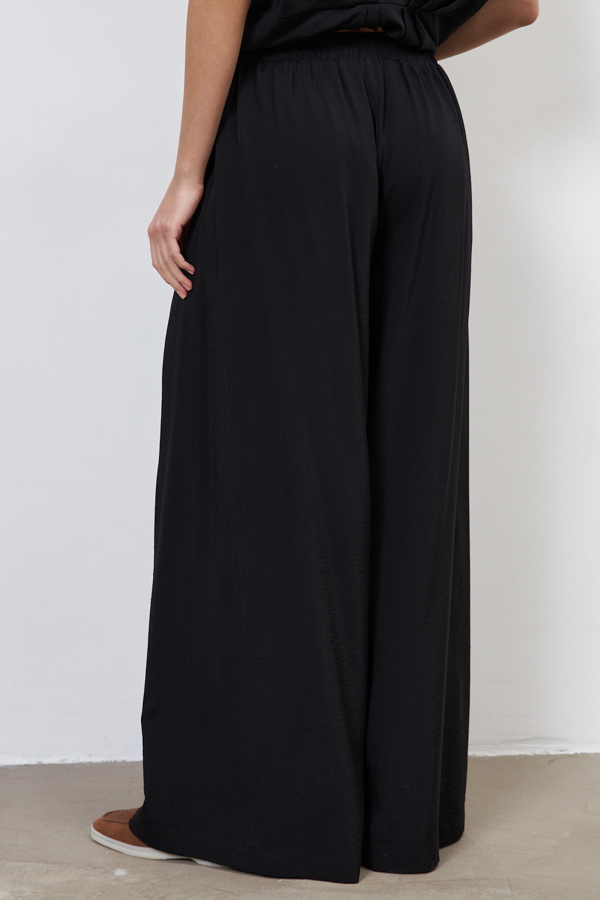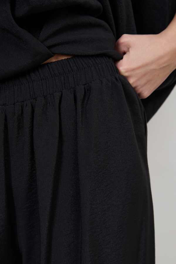 Брюки прямого силуэта из вискозной ткани с крэш-эффектом. Пояс с эластичной резиной, в боковых швах карманы.