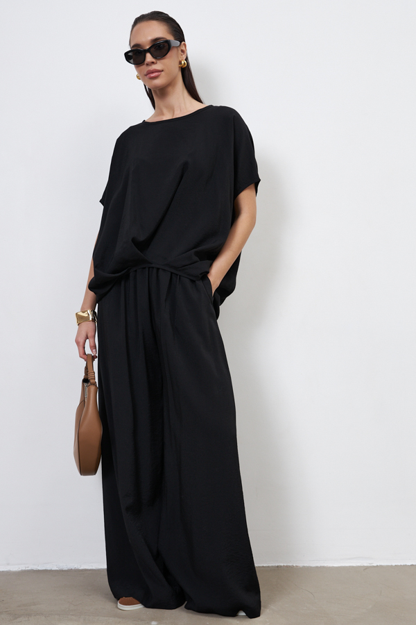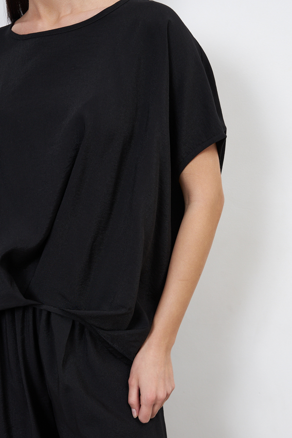 Блуза из вискозной ткани с крэш-эффектом. Свободный крой асимметричной длины (спинка удлинена относительно переда). Спущенное плечо. Линия проймы, линия горловина и низ изделия окантованы косой бейкой из основной ткани. Изюминкой являются оригинальные складки на передней и задней части изделия.