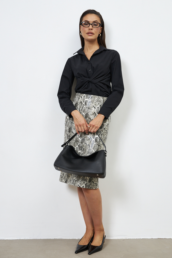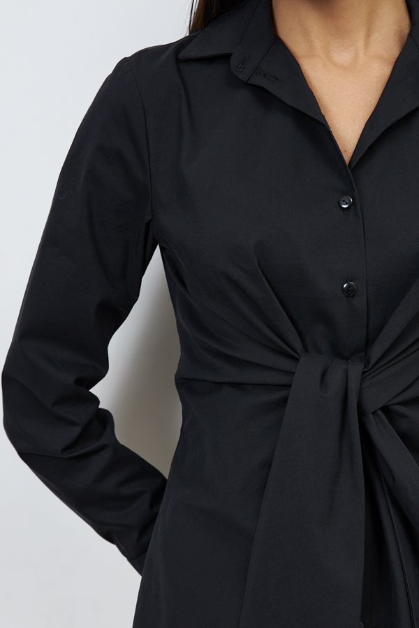 Рубашка из хлопковой ткани прилегающего силуэта с застёжкой на пуговицы. Оригинальный крой с завязками на передней части изделия. На задней части выполнены вытачки. Рубашечный рукав на манжете с застёжкой на пуговицы. Вырез горловины обработан отложным воротником на стойке.