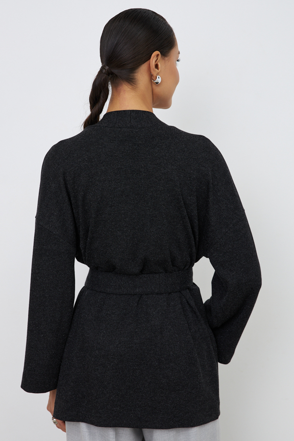 Кардиган из меланжевого эластичного полотна. Свободный силуэт с притачной планкой. Втачной широкий рукав в спущенную пройму. В комплекте пояс, позволяющий создавать приталенный силуэт.