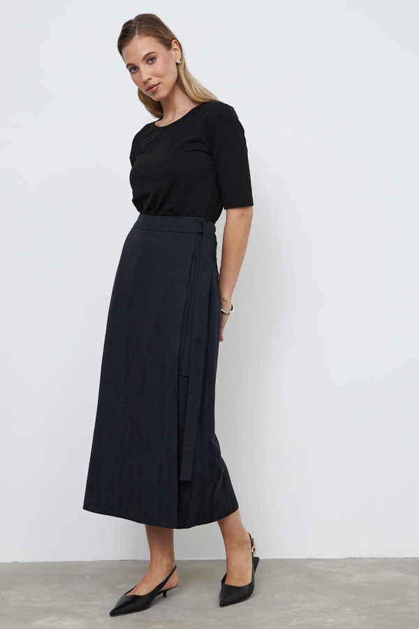 Юбка из вискозной ткани с запахом на широких завязках. Прямой силуэт с притачным поясом. Изделие с запахом не только выглядят интересно, но и делают фигуру более гармоничной.