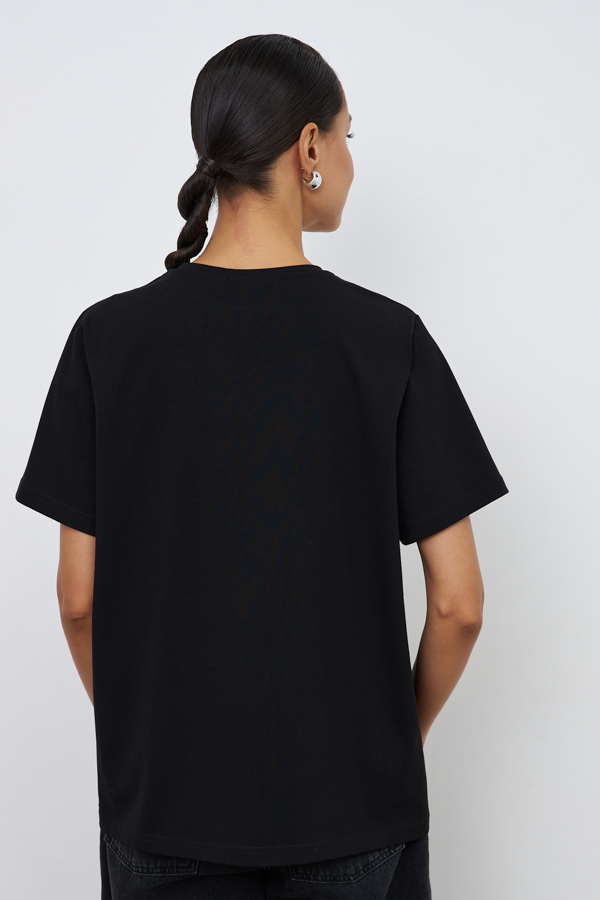 Джемпер из хлопкового эластичного полотна свободного силуэта. Втачной короткий рукав. Круглый вырез горловины оформлен бейкой.