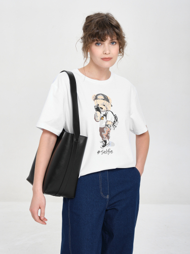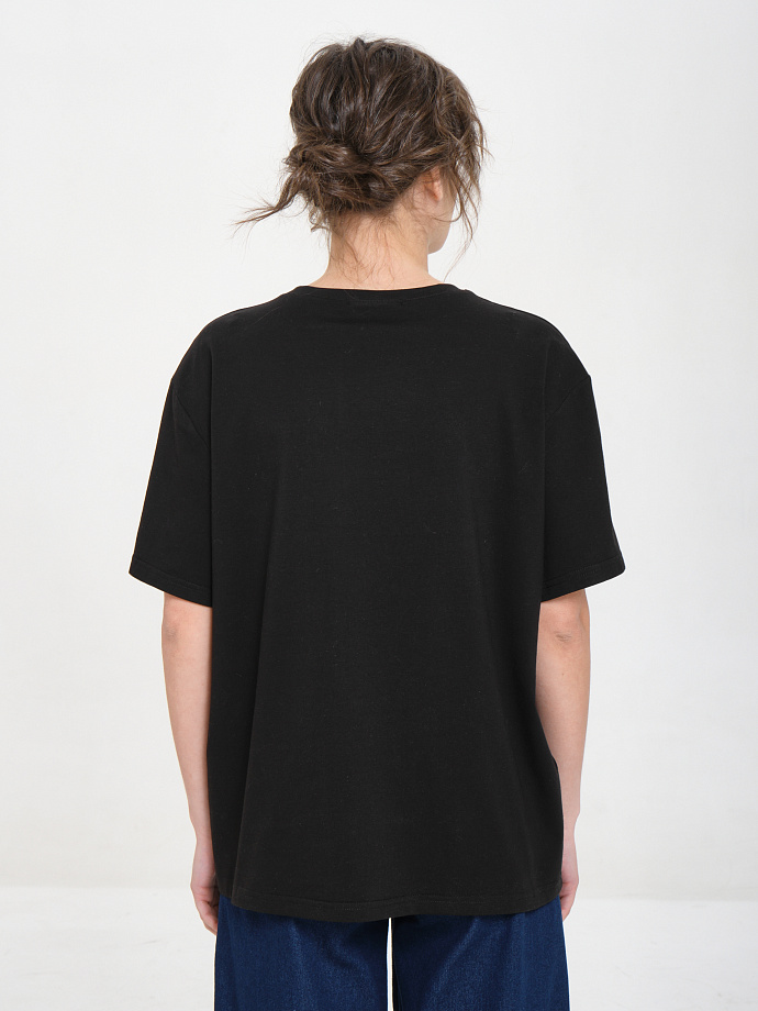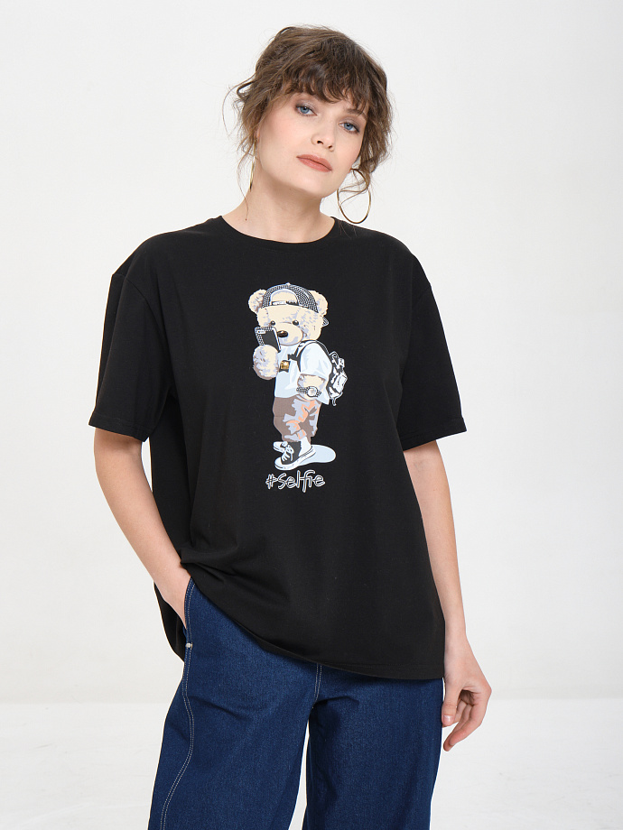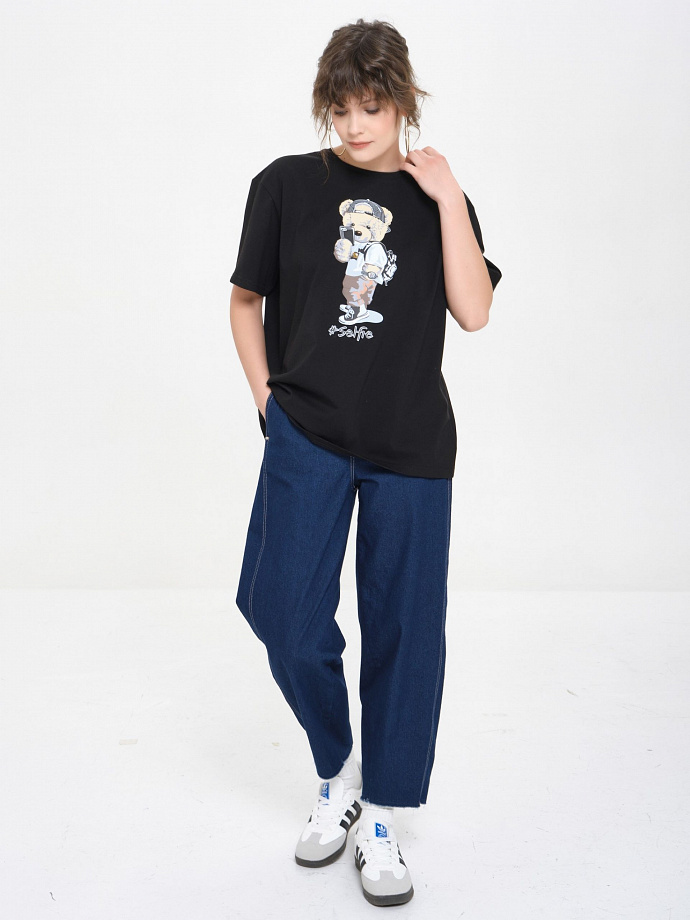 Футболка оверсайз с принтом, вышивкой и стразами.