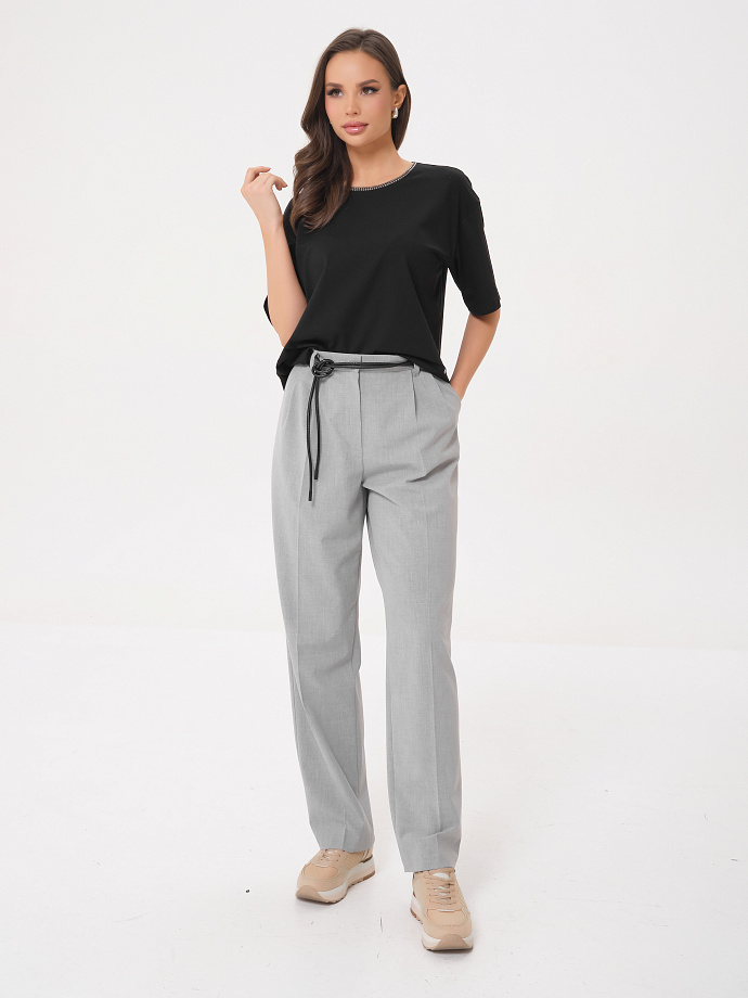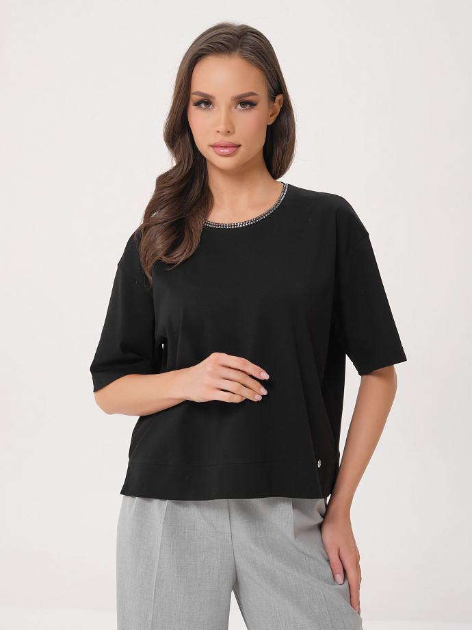 Модель прямого силуэта, со спущенным плечом. Низ футболки обработан притачным поясом. В боковых швах разрезы. Горловина обработана бейкой, по переду декорирована стразами.